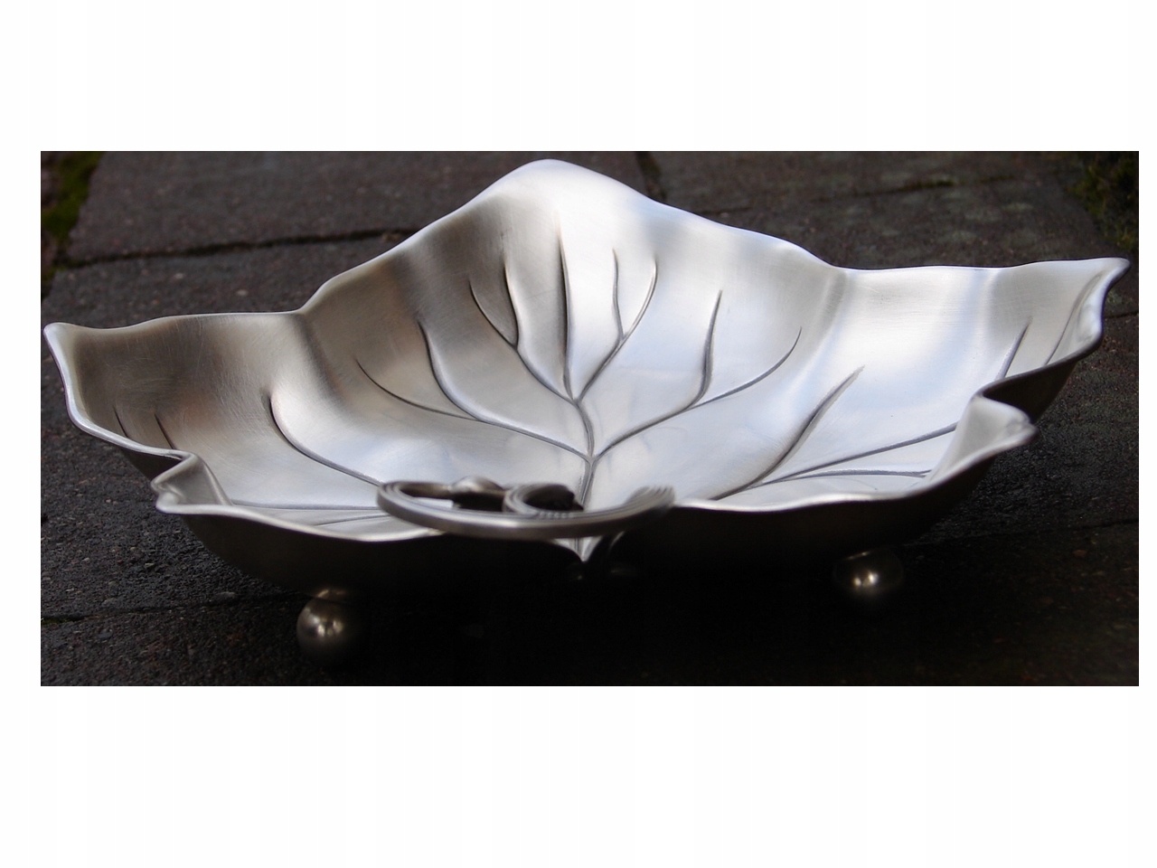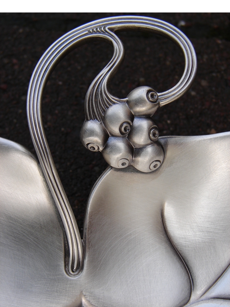 Патера для пирожных конфет, изготовленных в стиле нуво в виде листовой ручки, украшенной плодом в форме база -рельефа чаши, поддерживаемой на трех сферических ногах. Объект серебряным или альпака. ul>