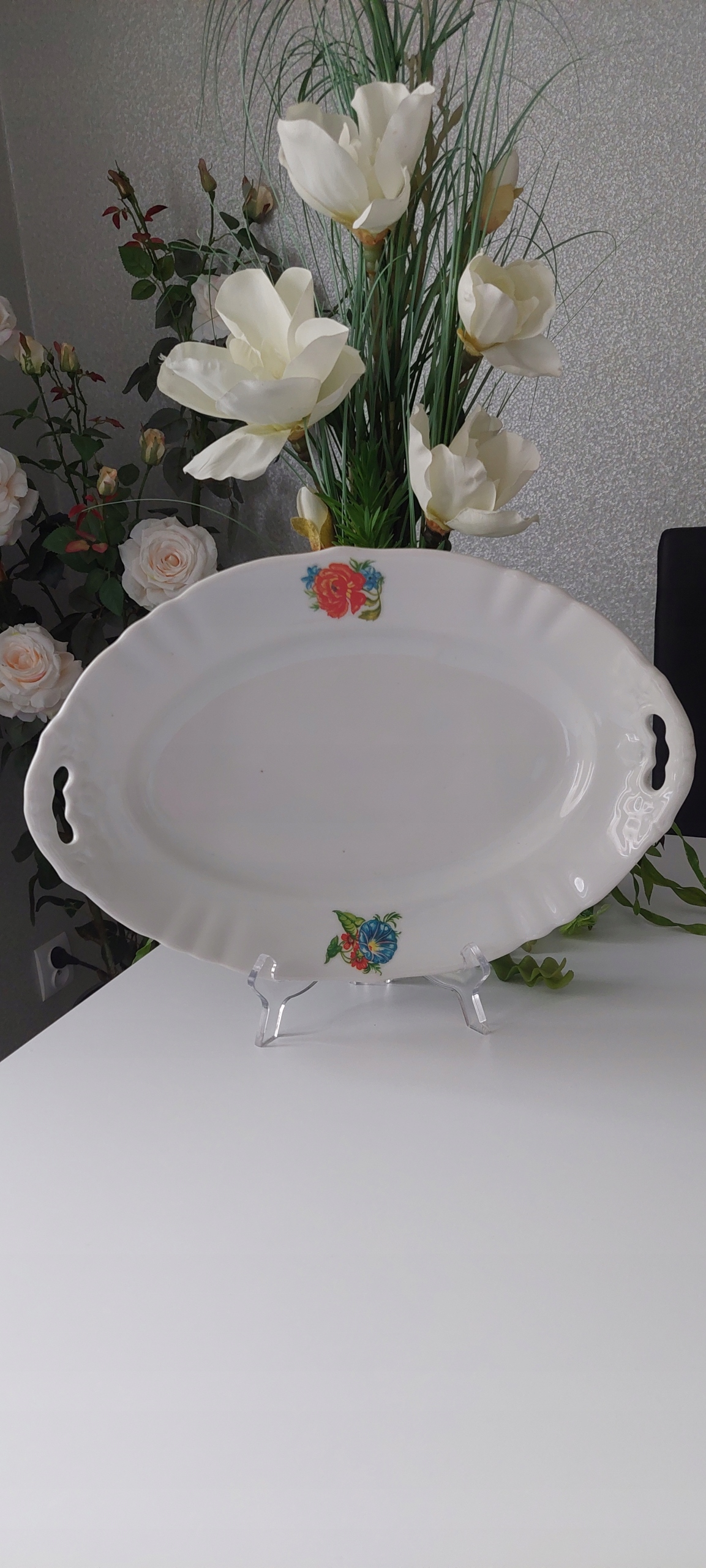 38 см Патера, шириной 26 см. Патера имеет эмалированные царапины и черные пятна, видимые на картинках.