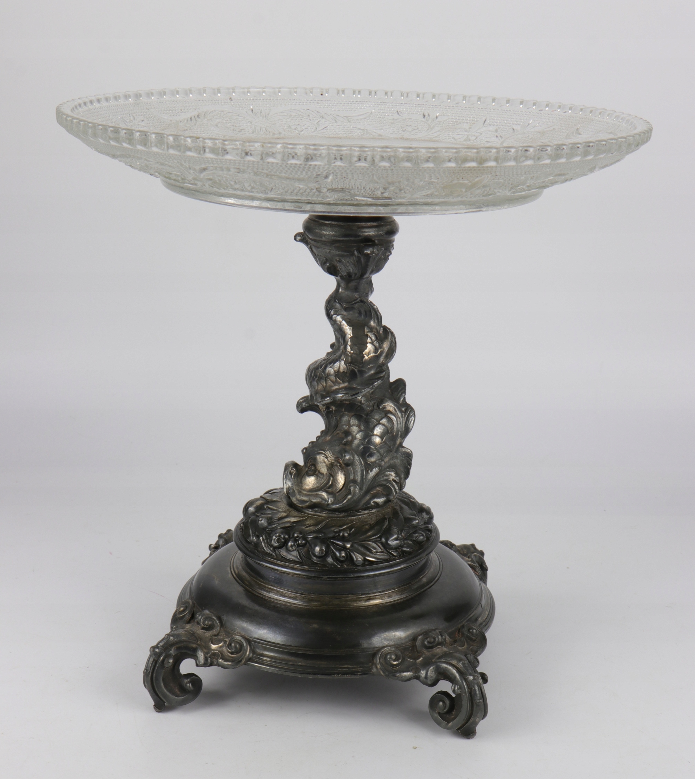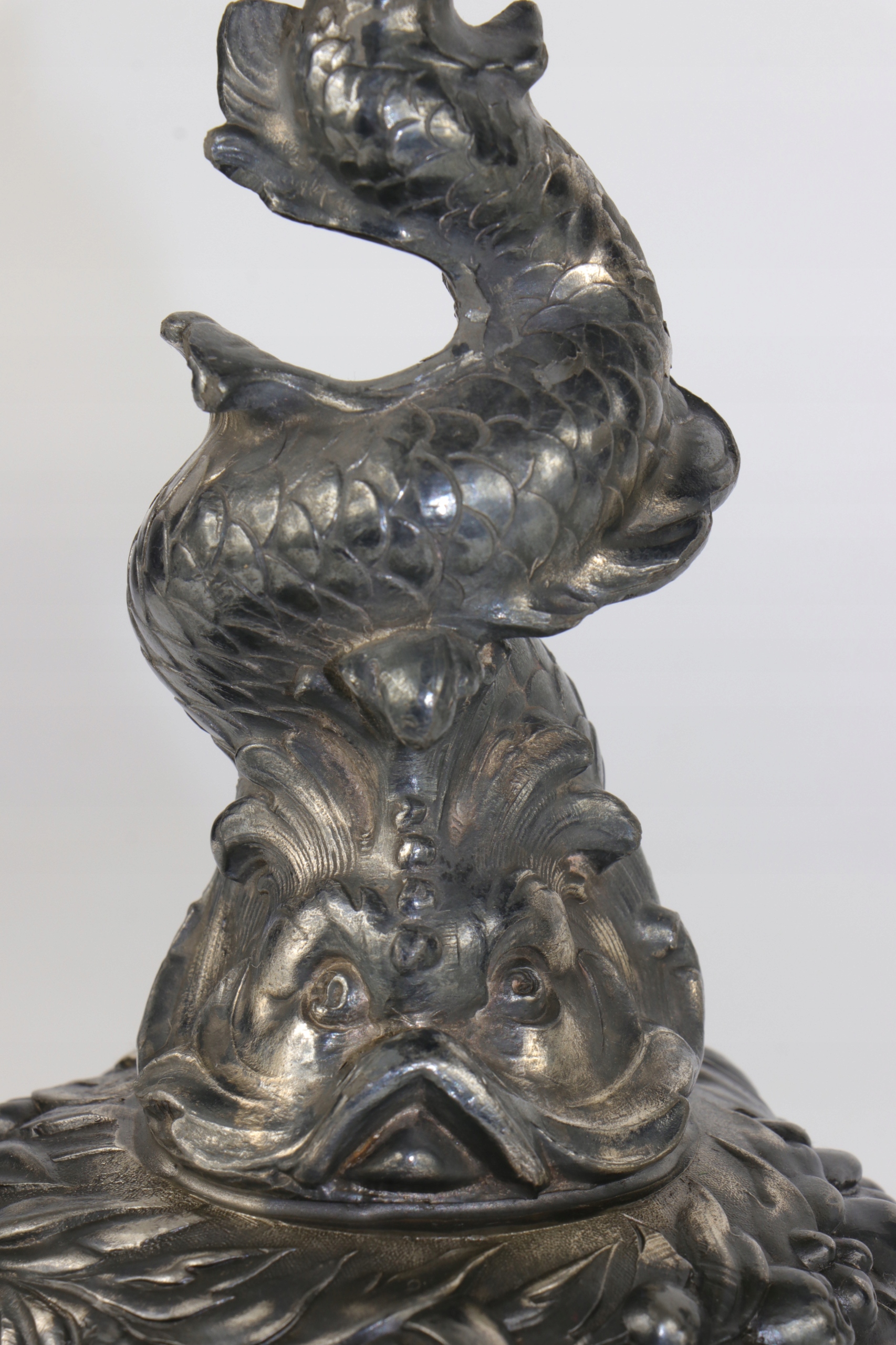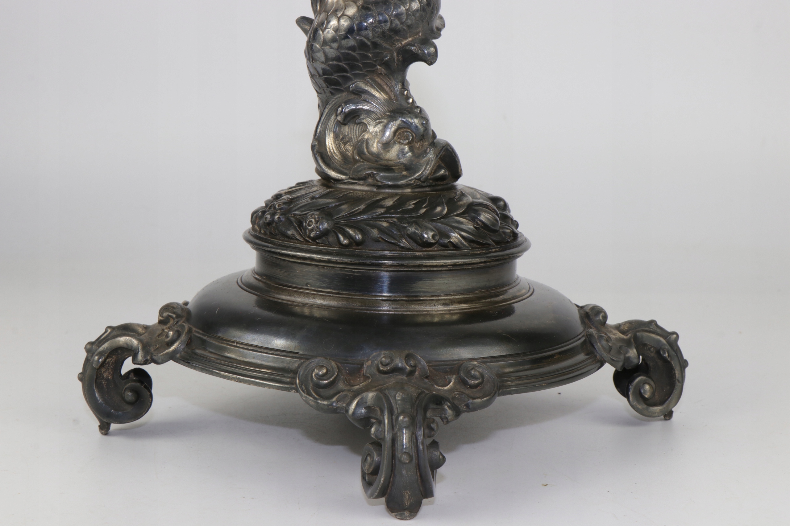 Интересная нео -барока Патера со второй половины 19 -го века. Красиво стильное основание в форме мифологической рыбы дельфинов. База с богатыми облегчением украшениями. В базовом укусе номер 46. Стеклянная пластина, нажатое стекло.
