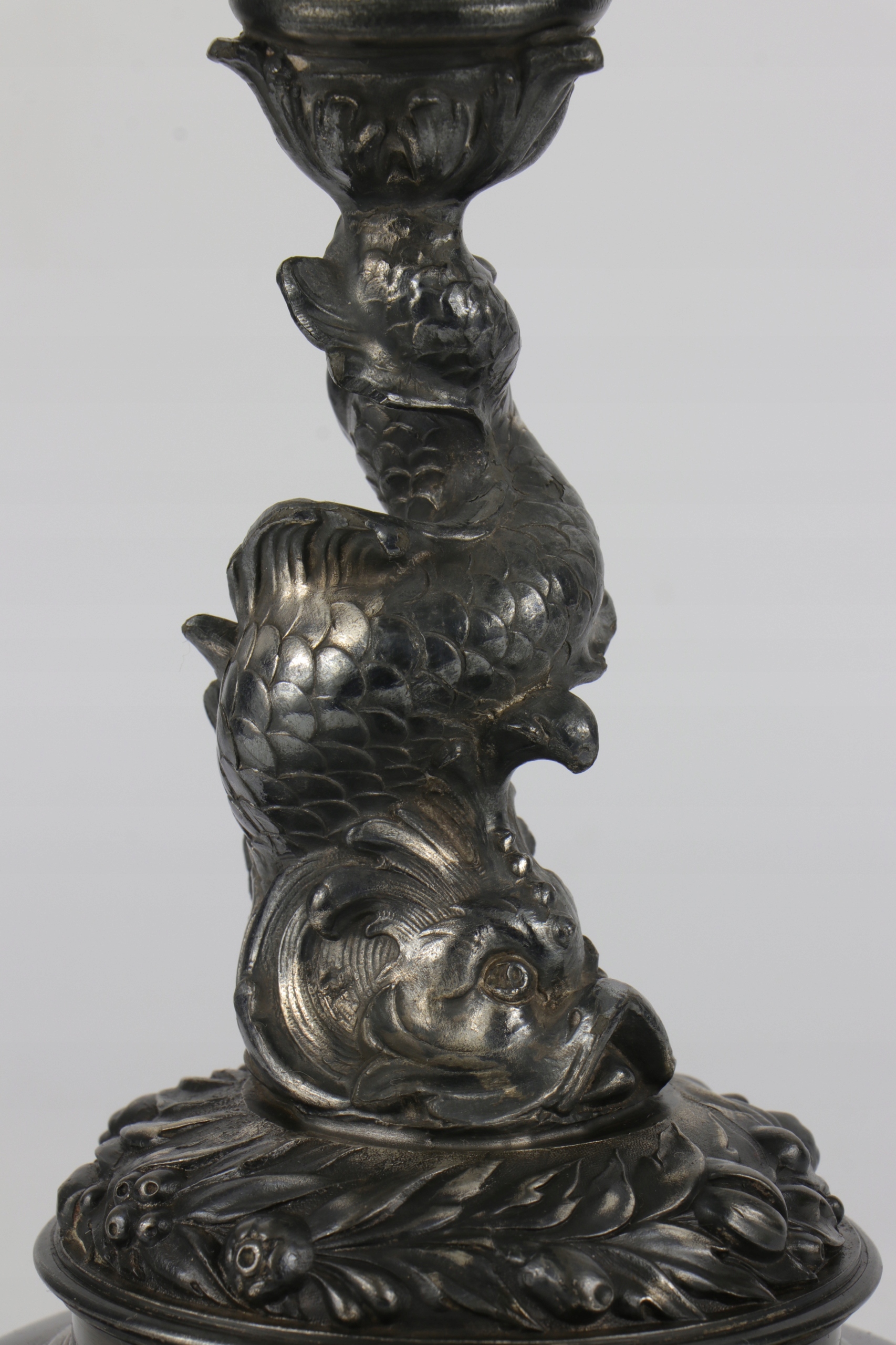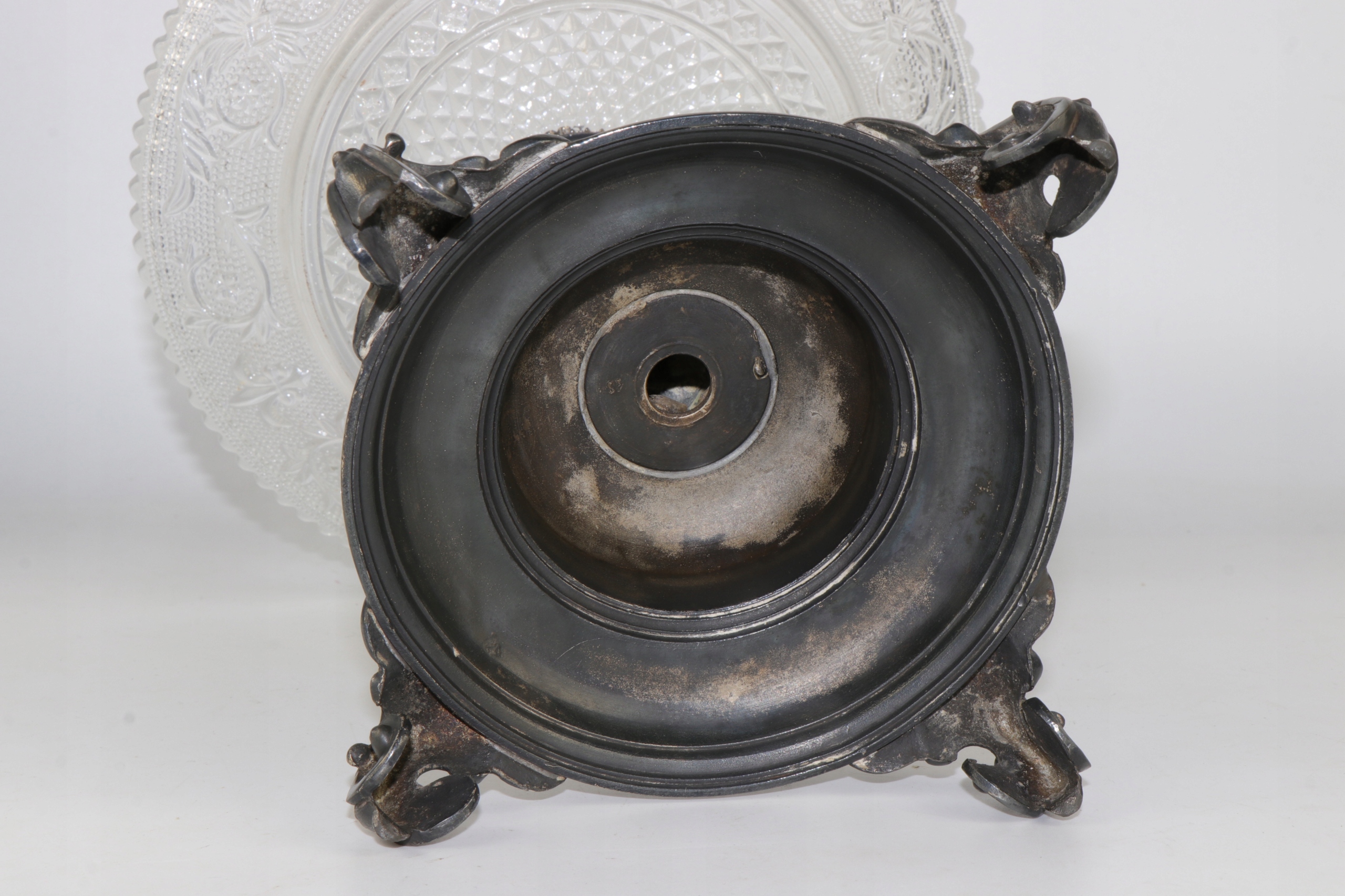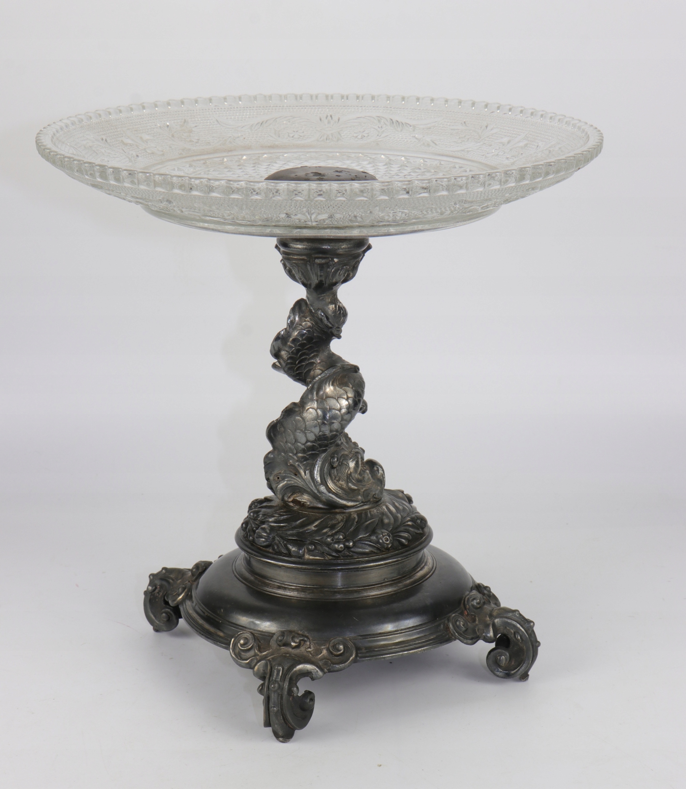 Интересная нео -барока Патера со второй половины 19 -го века. Красиво стильное основание в форме мифологической рыбы дельфинов. База с богатыми облегчением украшениями. В базовом укусе номер 46. Стеклянная пластина, нажатое стекло.