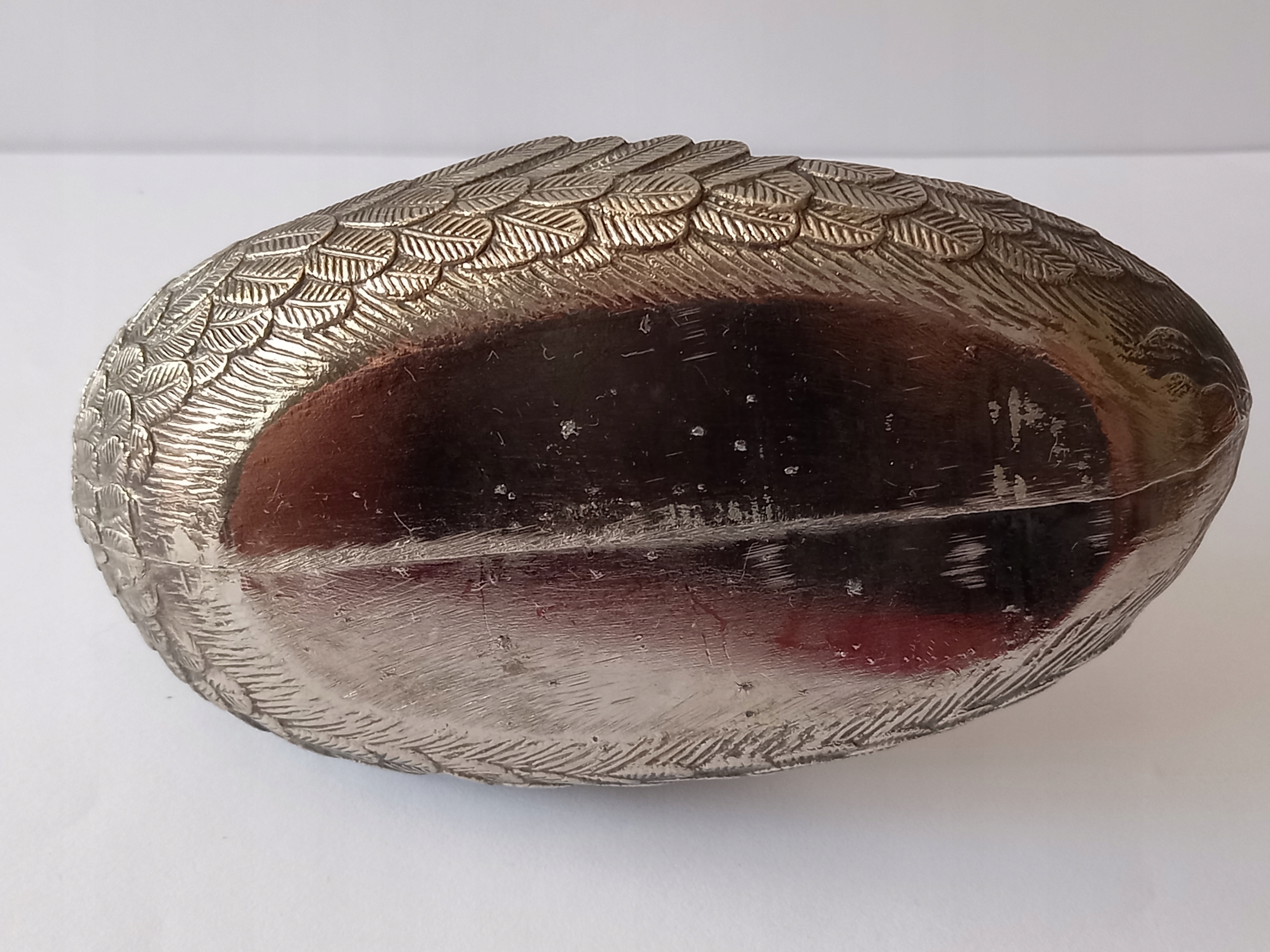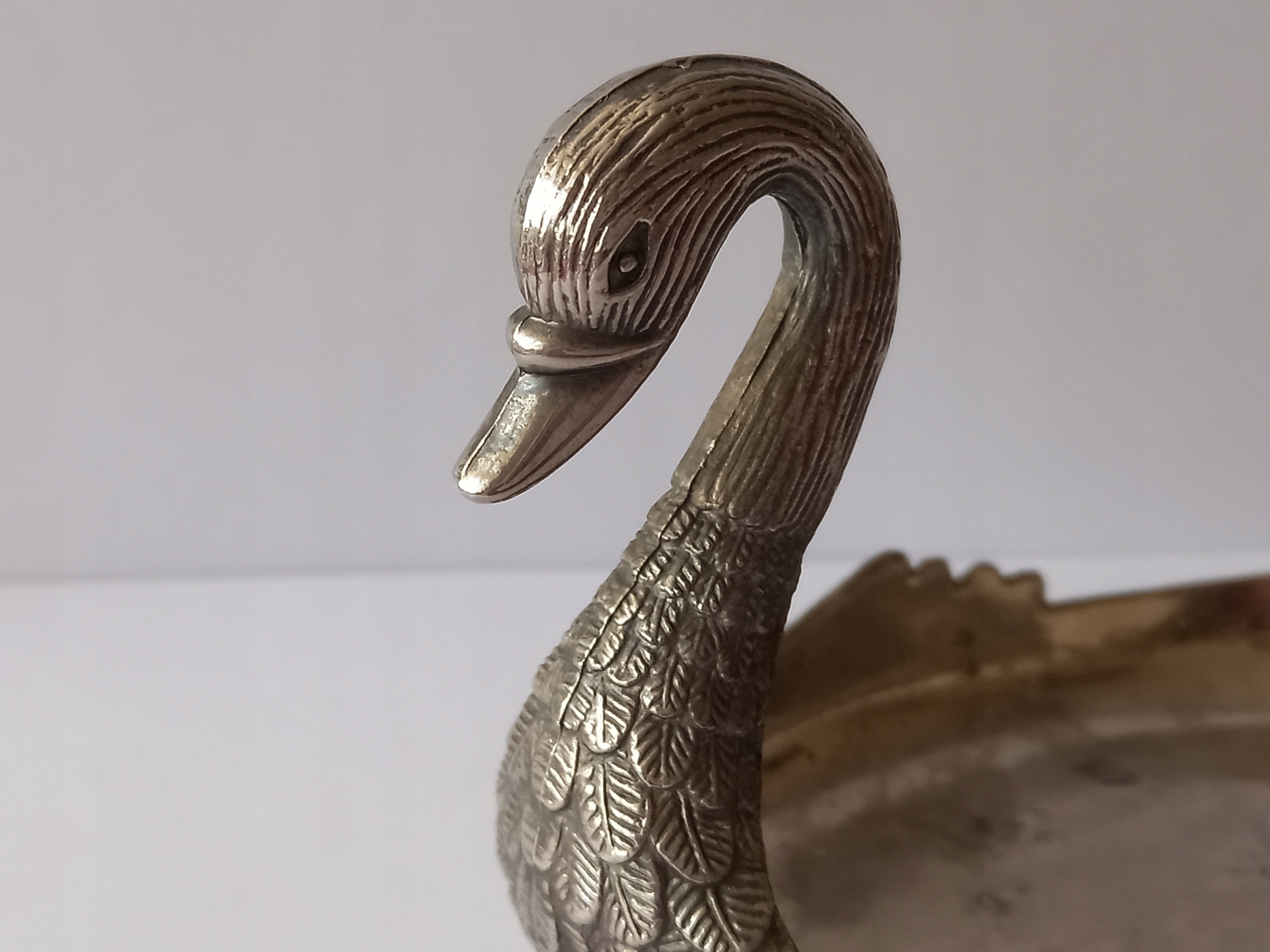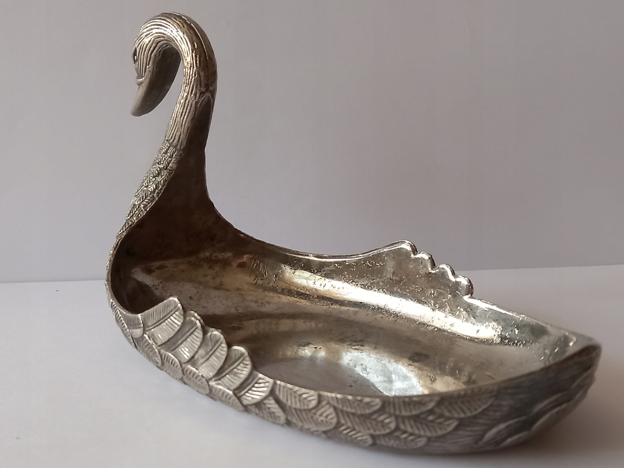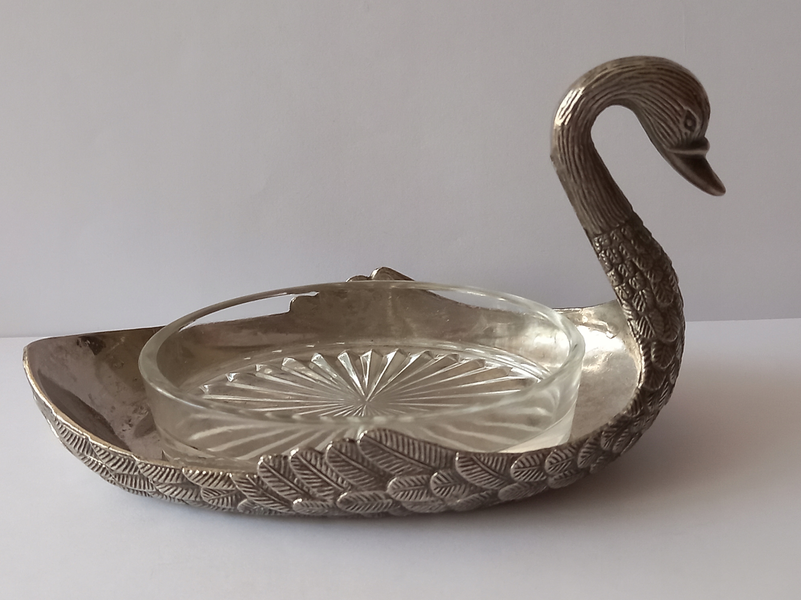 Красивая подставка для торта для орехов, сладостей или специй для горчицы, хрена, зелени и т.п. со стеклянной вставкой [вставка не подходит к подставке для торта, она не оригинал]. Изделие не новое, внутри повреждено. Изделие выполнено из белой латуни или металла [магнит не притягивает].