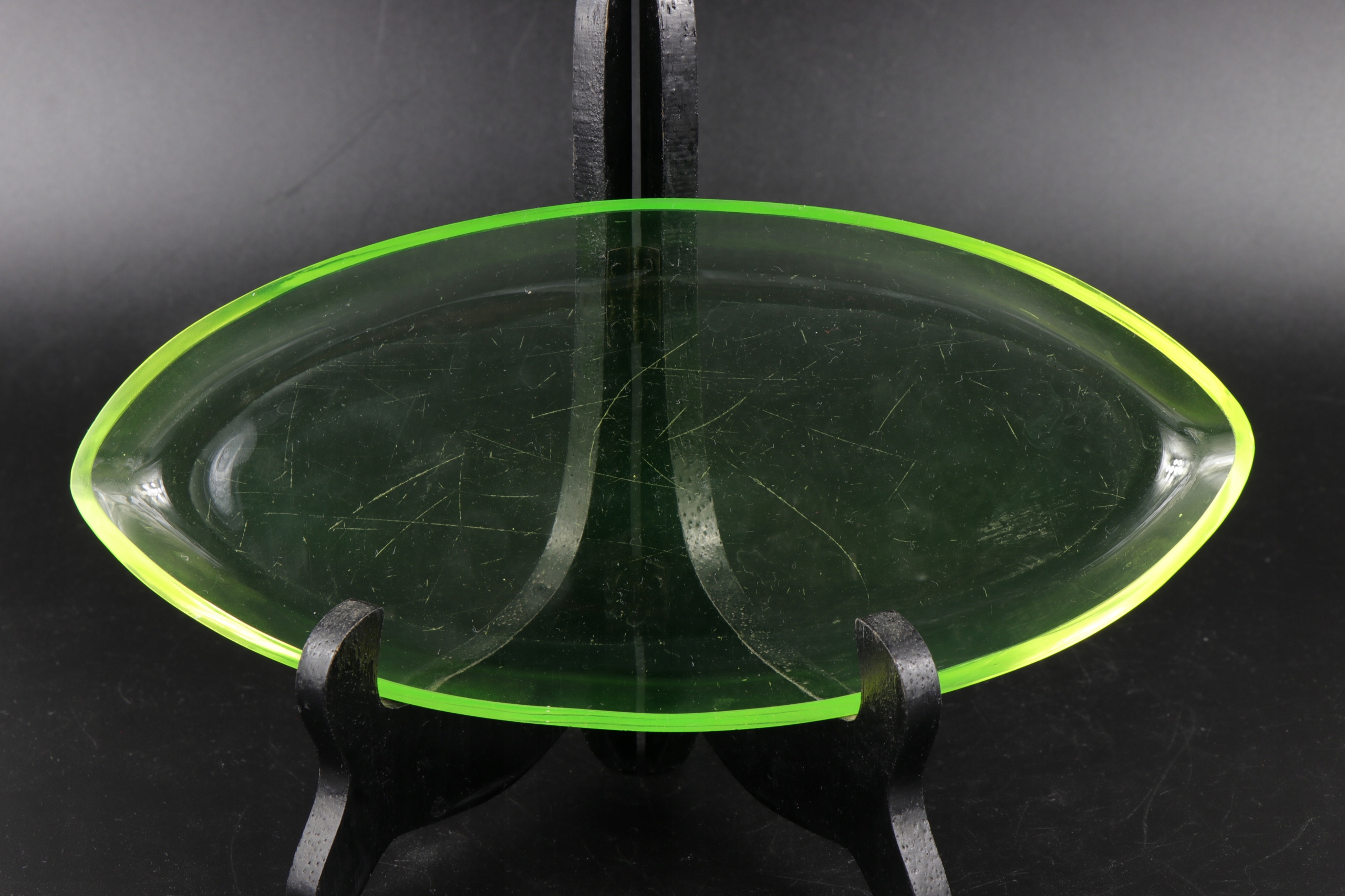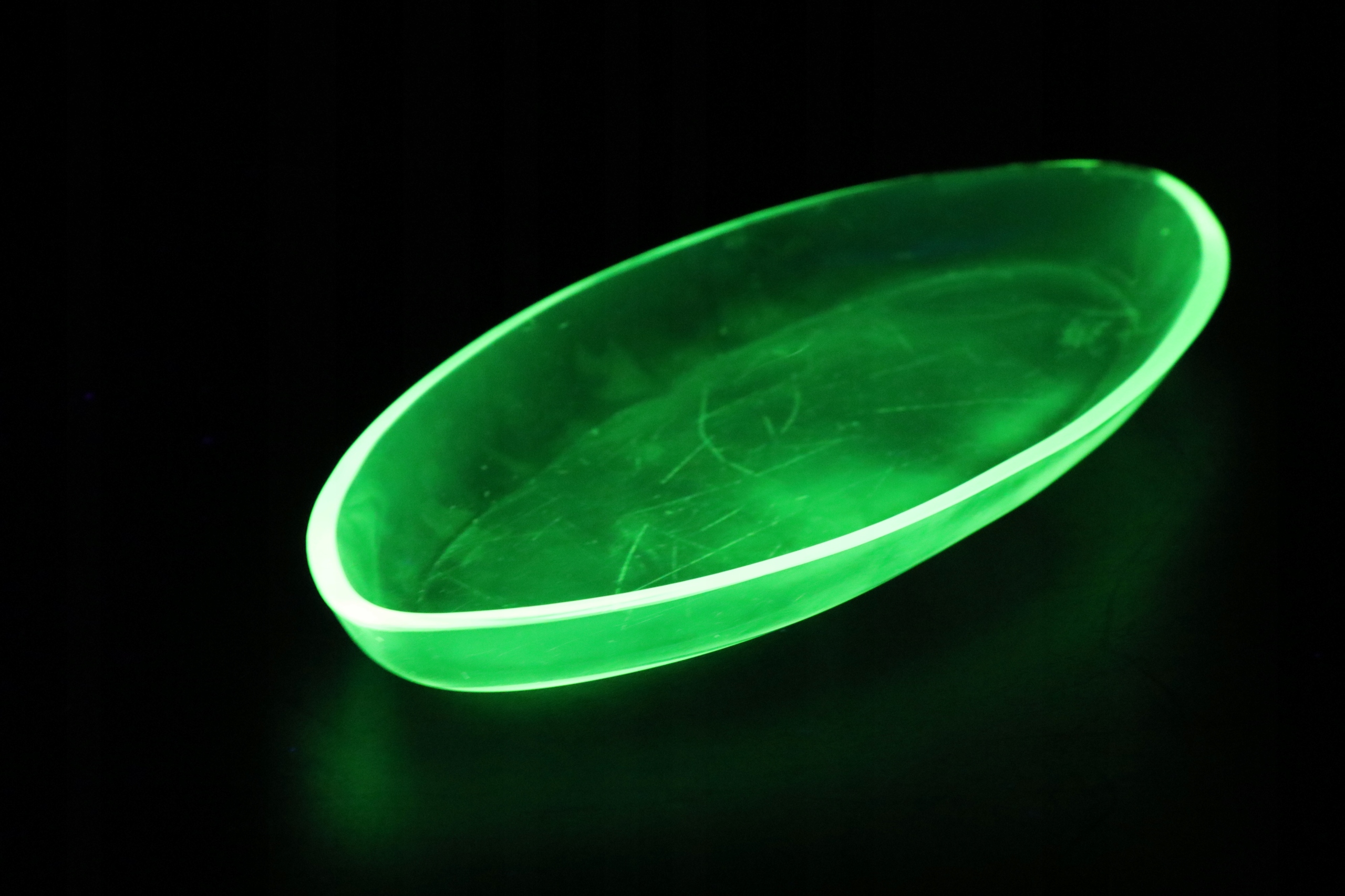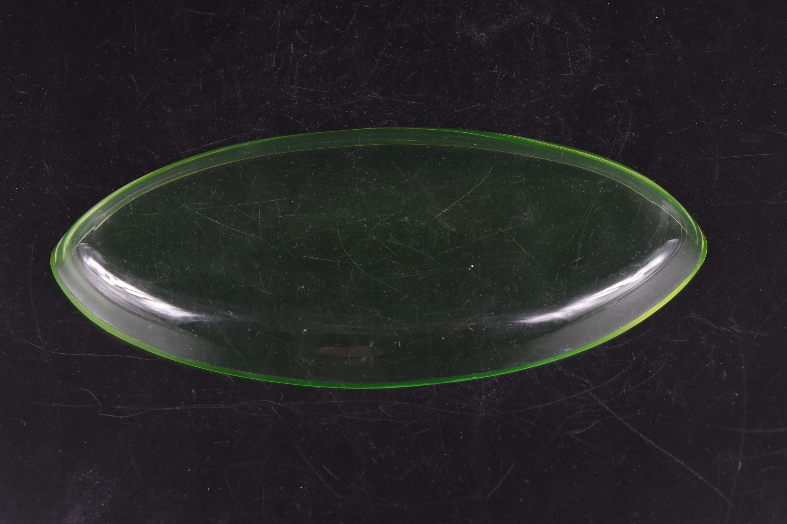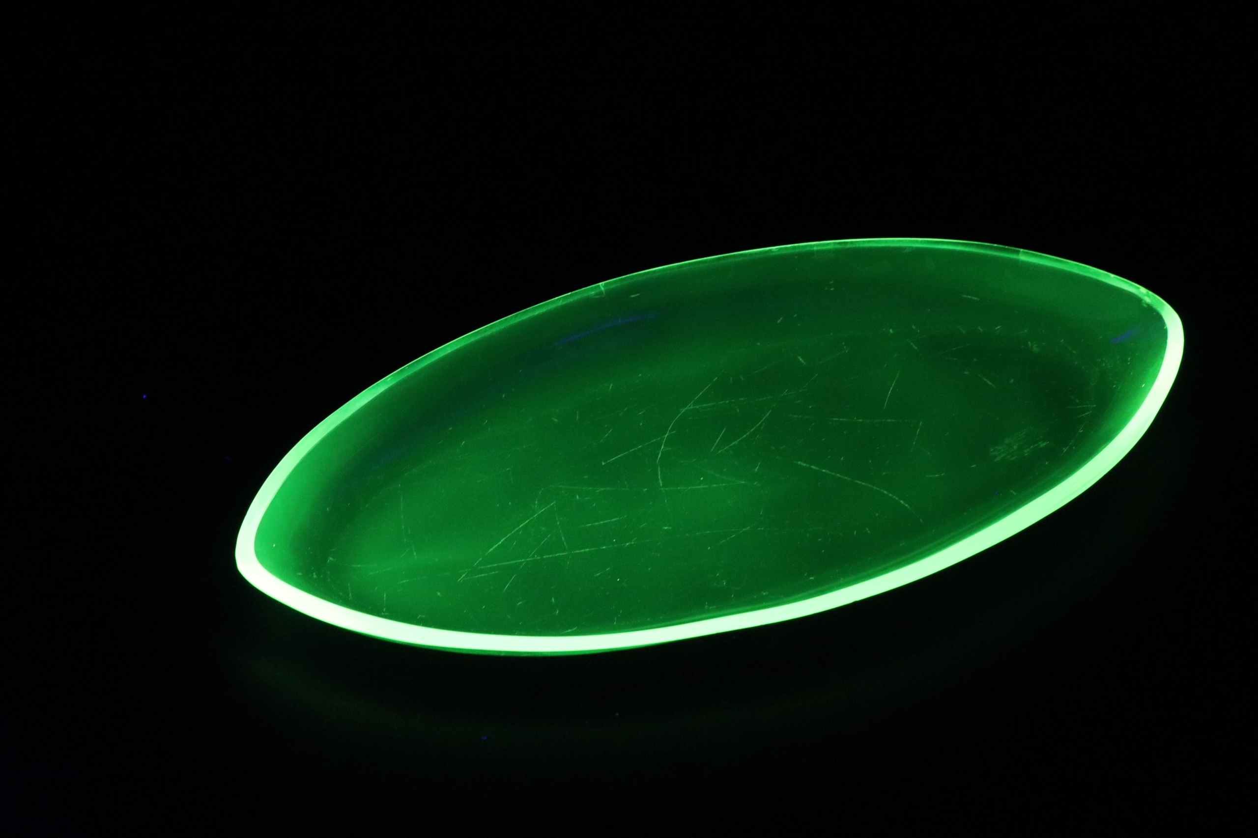 Пластина паттерка из уранового стекла. Стекло в светло -зеленом цвете. На других аукционах я поместил другие предметы из уранового стекла. Некоторые фотографии, сделанные в UV Light