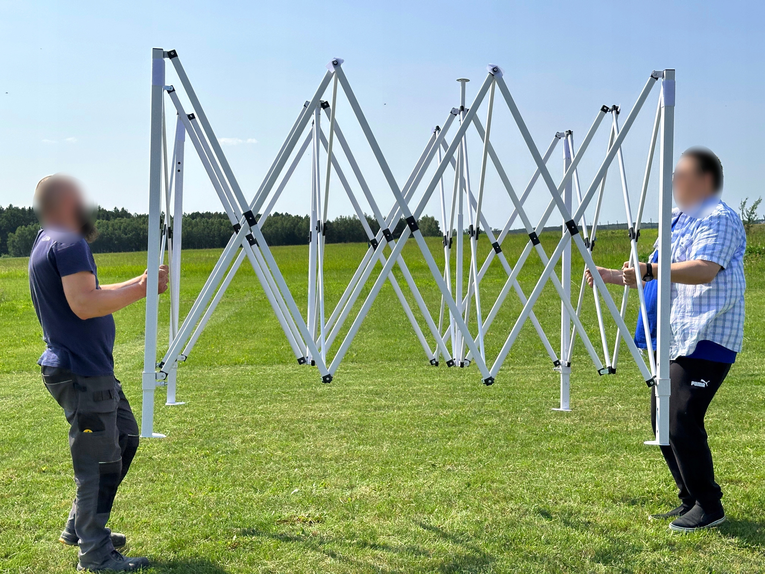 Шестиугольные стальные профили имеют диаметр примерно 40 мм, поэтому они намного более долговечны, чем традиционные палатки с профилями толщиной 30 мм. Почему? Увеличение количества стали на 25 % обеспечивает большую несущую способность и жесткость конструкции. Конструкция изготовлена ​​из стали с порошковым покрытием элегантного белого цвета.