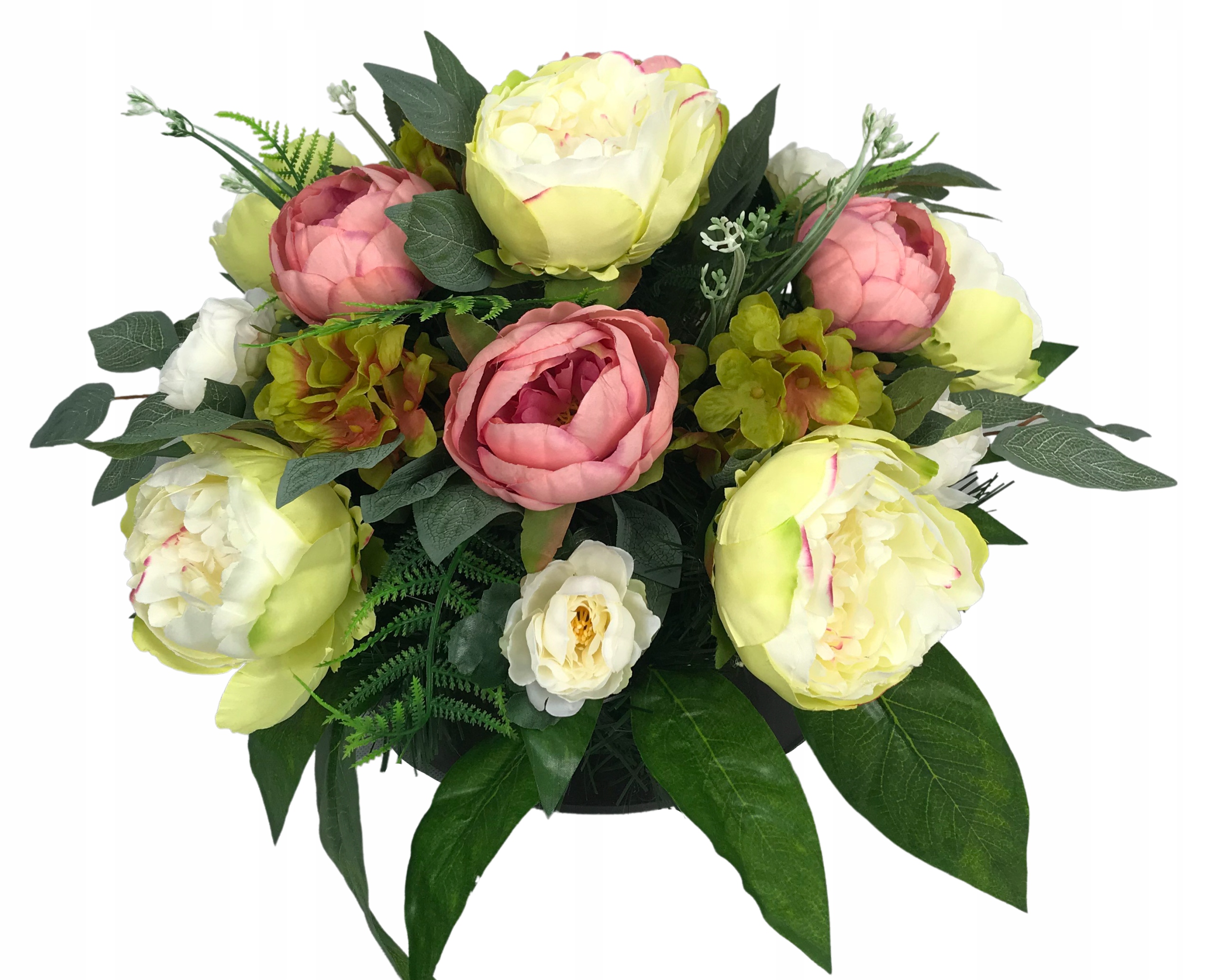 Цветочная композиция изготовлена из искусственных цветов высочайшего качества. и добавки. Для создания декора были использованы красивые пионы разных размеров, гортензии, большое количество зеленых листьев, а также большое количество аксессуаров, заполняющих пустые места.