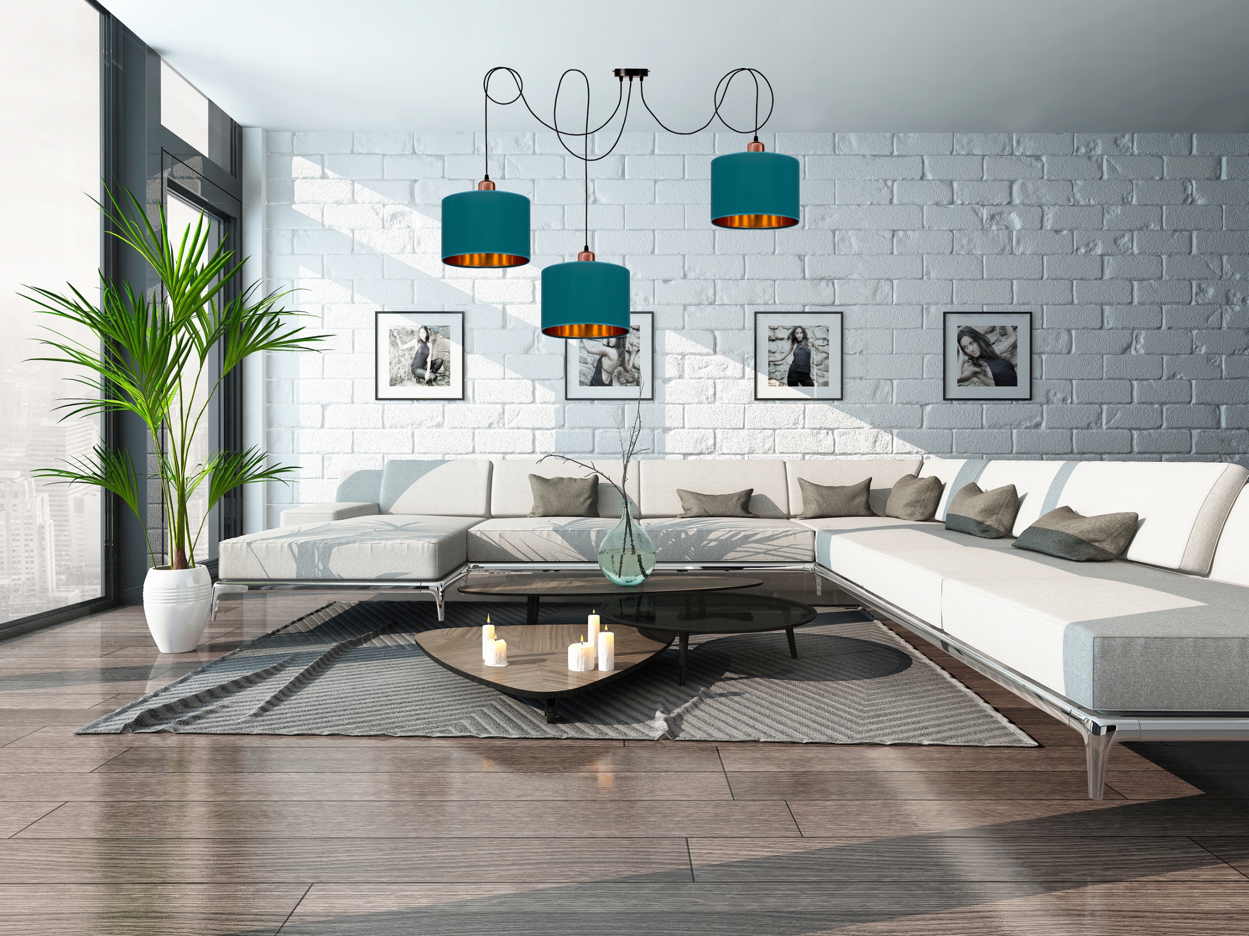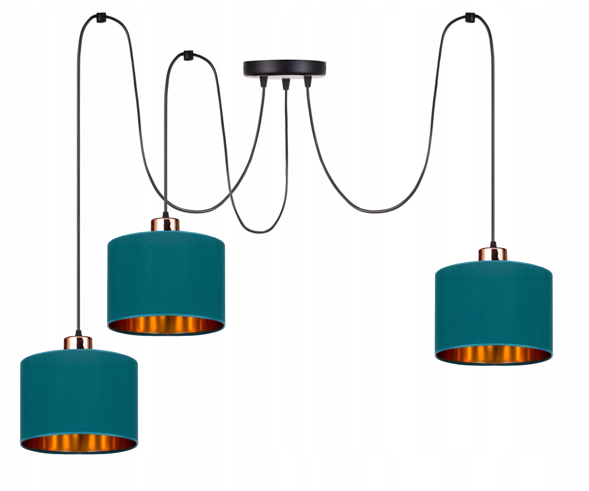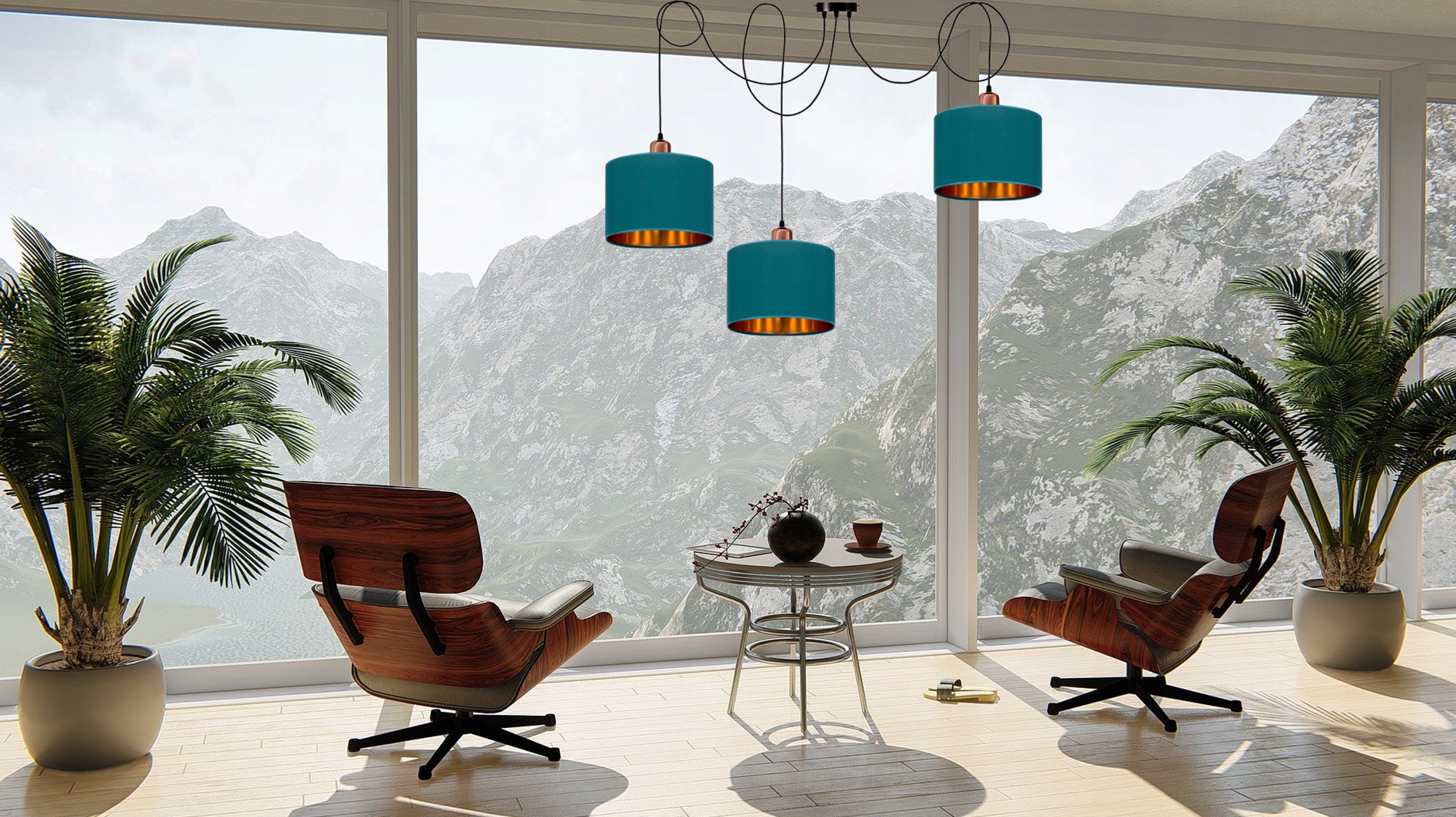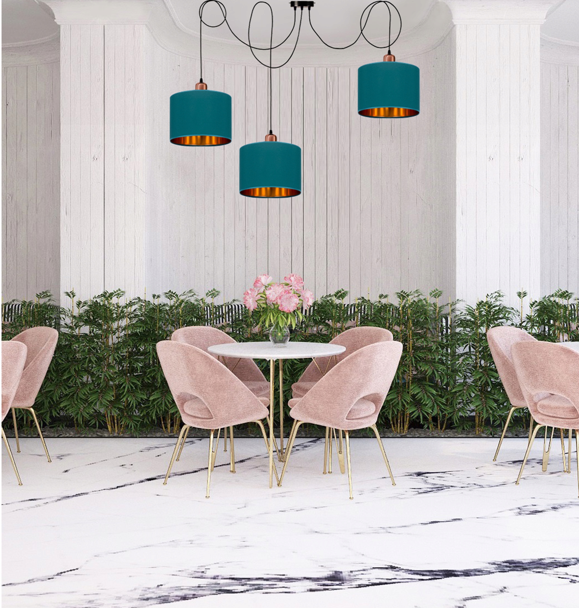 Круглые бирюзовые абажуры в форме цилиндра с золотой внутренней частью, помещенные на черную раму и подвешенные на регулируемых тросах, прекрасно вписываются в целое и дополняют современные интерьеры. Благодаря золотым и медным акцентам светильник выглядит чрезвычайно стильно и модно.