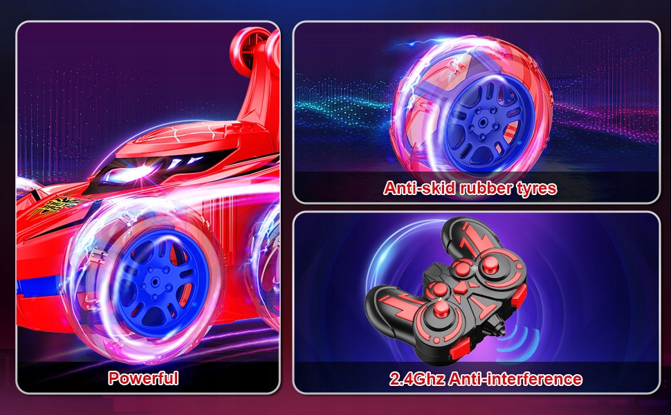 【акробальный автомобиль с поворотами 360 °】 может выполнять впечатляющую акробатику на 360 ° и перпендикулярное вождение под углом 90 °. В задней части и обратном управлении очень прост и легко. Дети могут веселиться с впечатляющей акробатикой. Отличные игрушки для мальчиков и девочек в возрасте 3, 4, 5, 6, 7 и 8 лет!