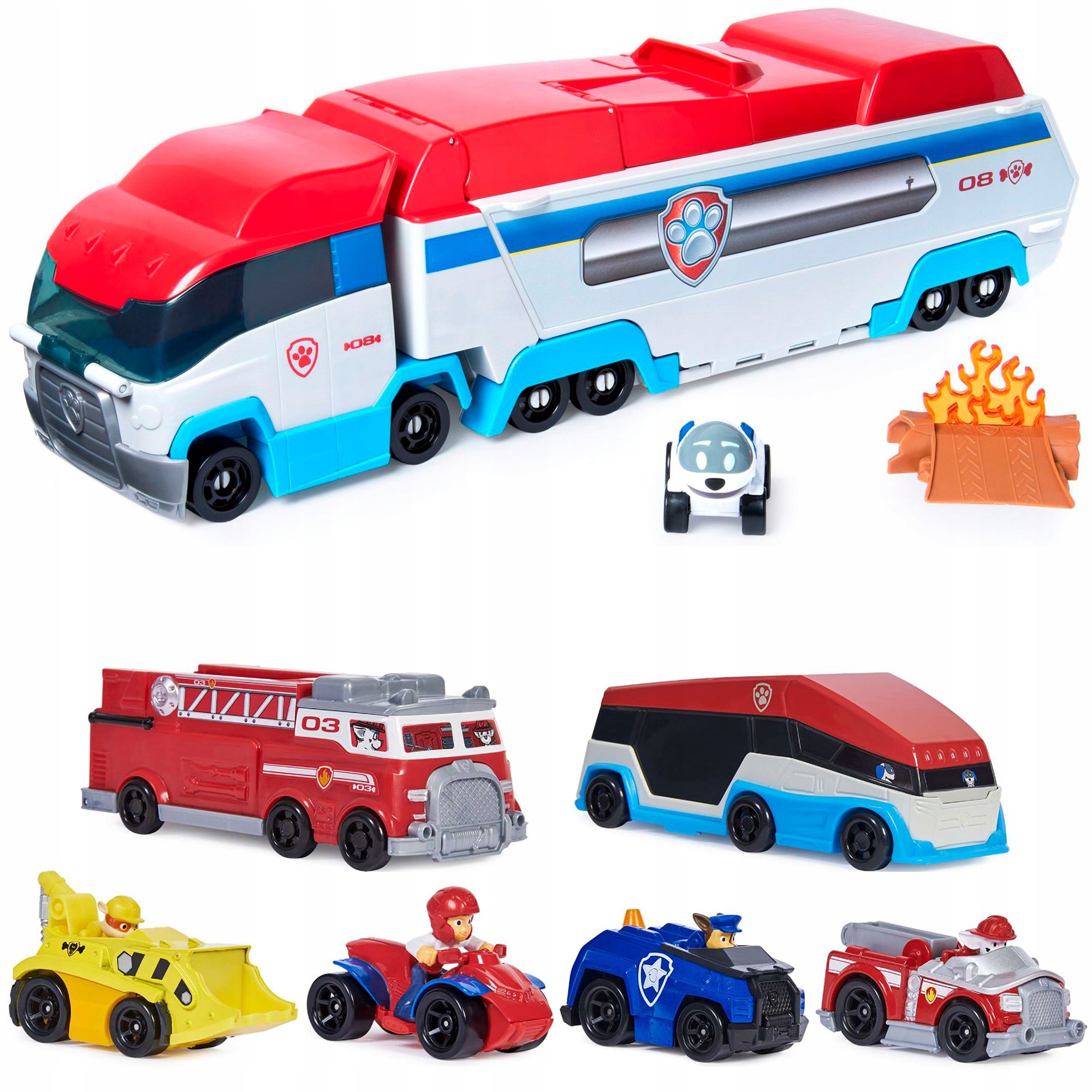 Патрулер белого, синего и красного цвета с тонированными стеклами и оснащен 12 колесами, что позволяет ему устойчиво передвигаться по ровным поверхностям. Прицеп грузовика разворачивается и превращается в большую игрушечную машину. Кроме того, разложенный грузовик позволит ребенку выполнять миссии, например тушить пожар, активировать автоподъемник или спасать медведя, застрявшего среди камней. В автомобиле всего может разместиться 7 металлических транспортных средств.