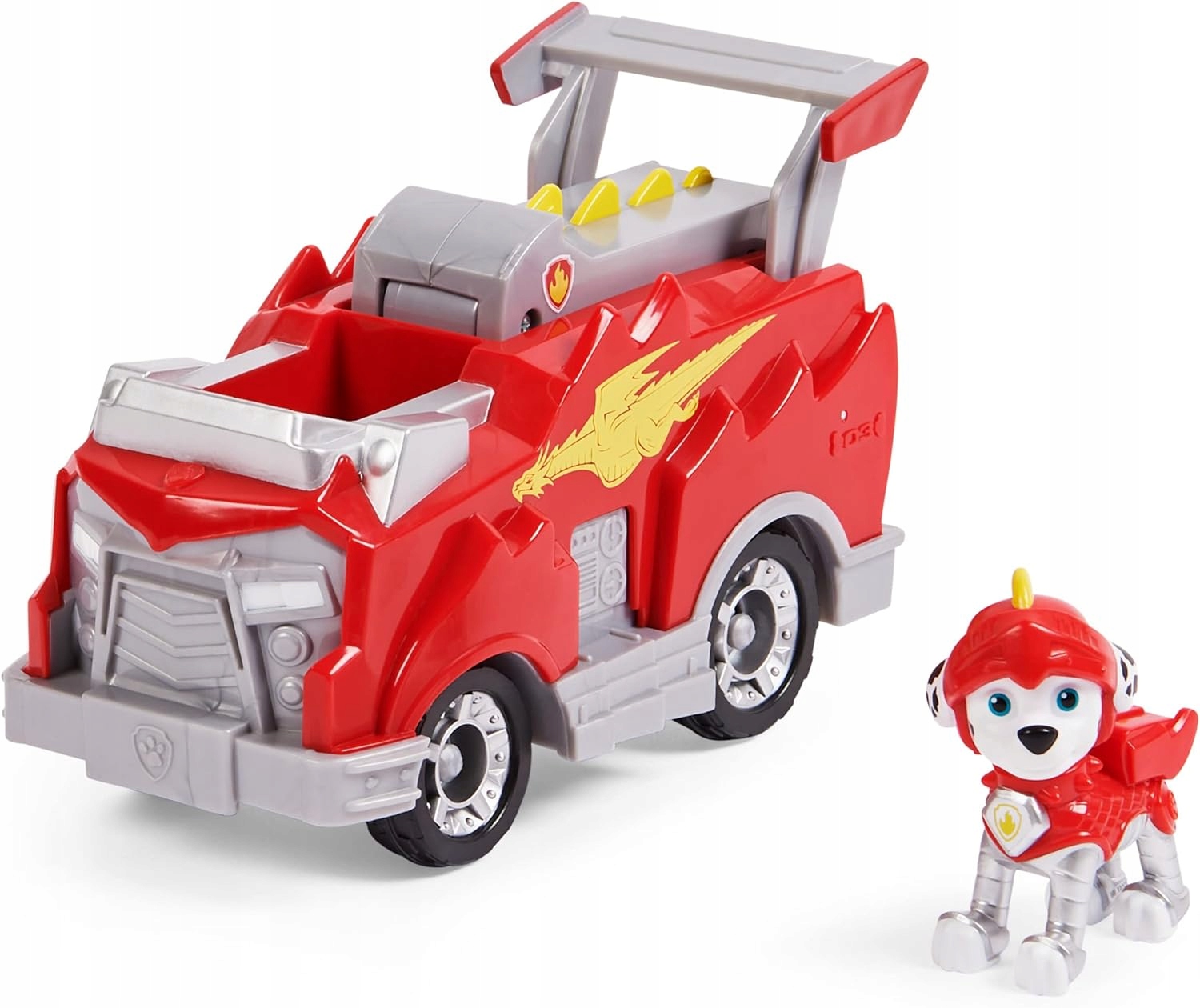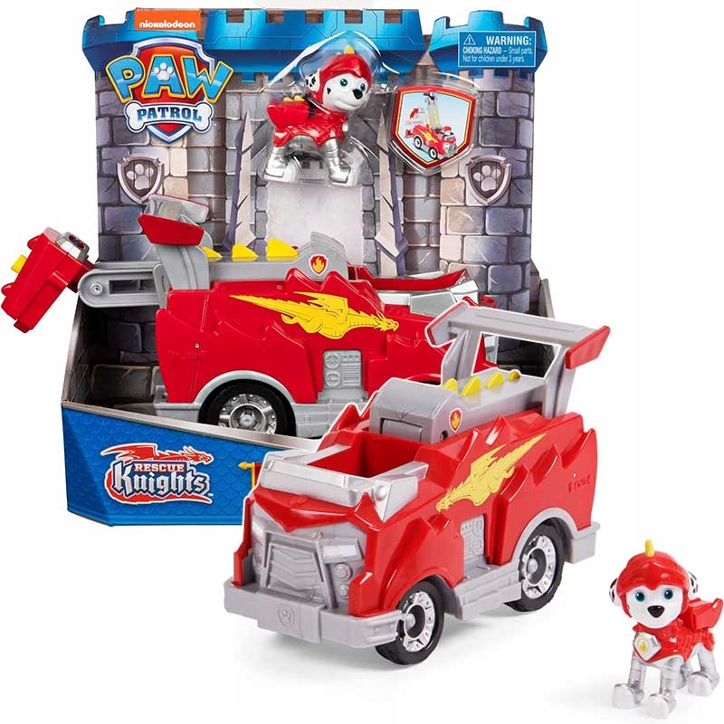 Патруль лапы для маленьких вентиляторов может воспроизвести новые приключения рыцарей из анимационного сериала с основным рыночным транспортным средством Маршалла, включая фигуру щенка. Истории делают сердце каждого рыцаря быстрее: сцена средневековых миссий - это замок, пушистые друзья вливаются в подлинную рыцарскую броню, и дракон замышляет. Базовый автомобиль имеет рисунок дракона и длиной около 15 см. В спасательной броне рыцари Маршалл высотой около 6-7 см и готов выполнить любую миссию. Нажатие спойлера на его автомобиле раскрывает пусковую установку его ракет.