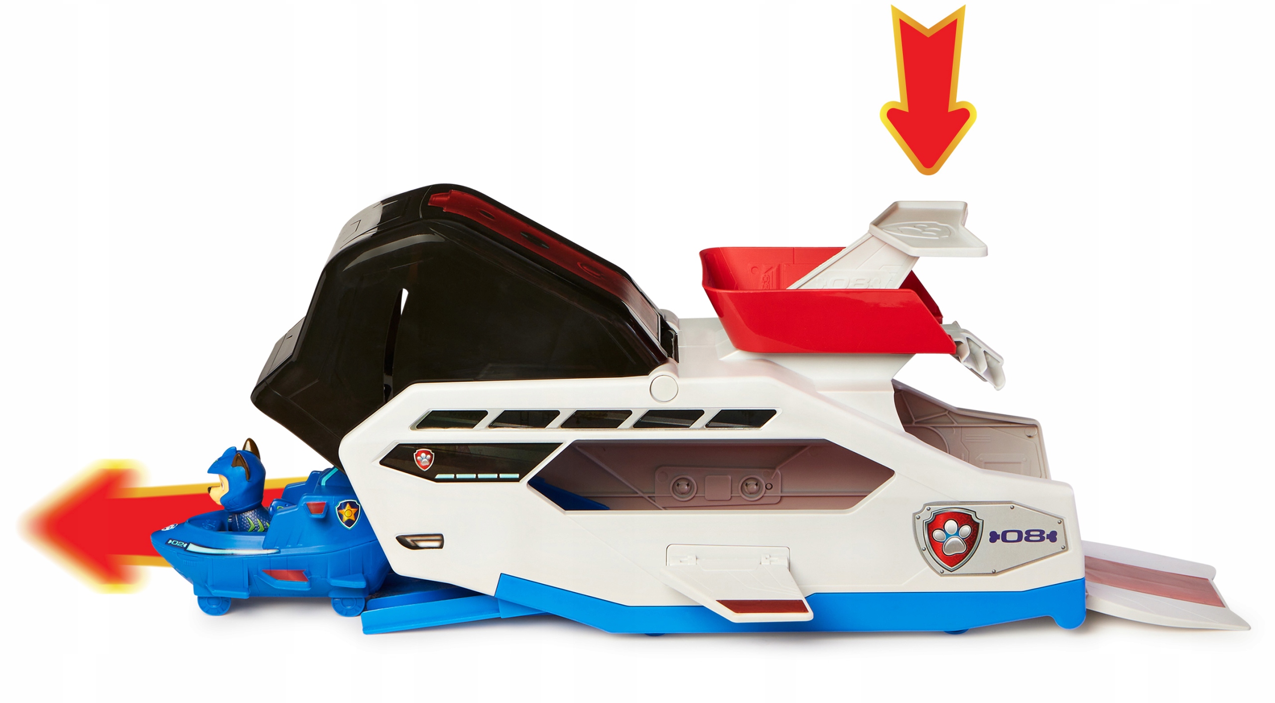 Патрульный по форме напоминает кита: у него большое черное лобовое стекло, через которое собаки могут наблюдать за подводным миром. За стеклом предусмотрено место для одного автомобиля из серии Aqua Pups с фигуркой собаки.
