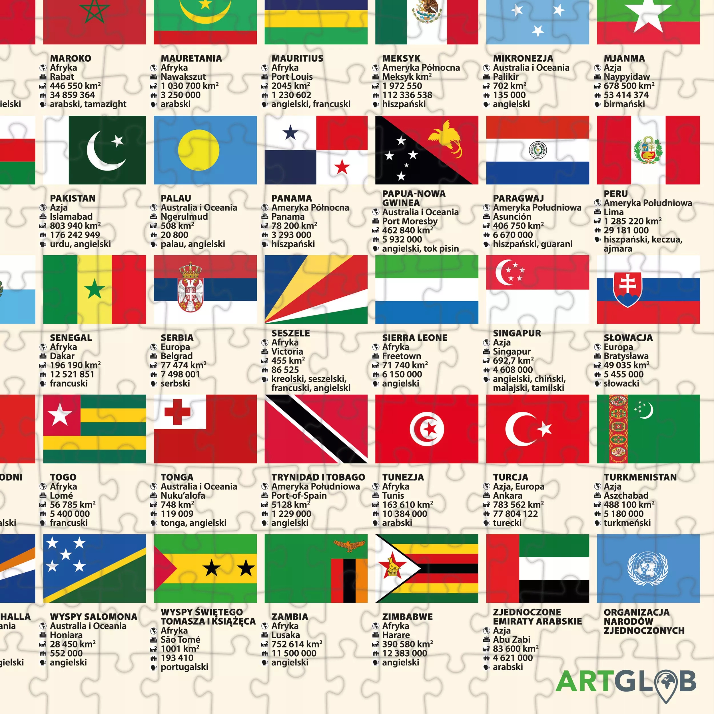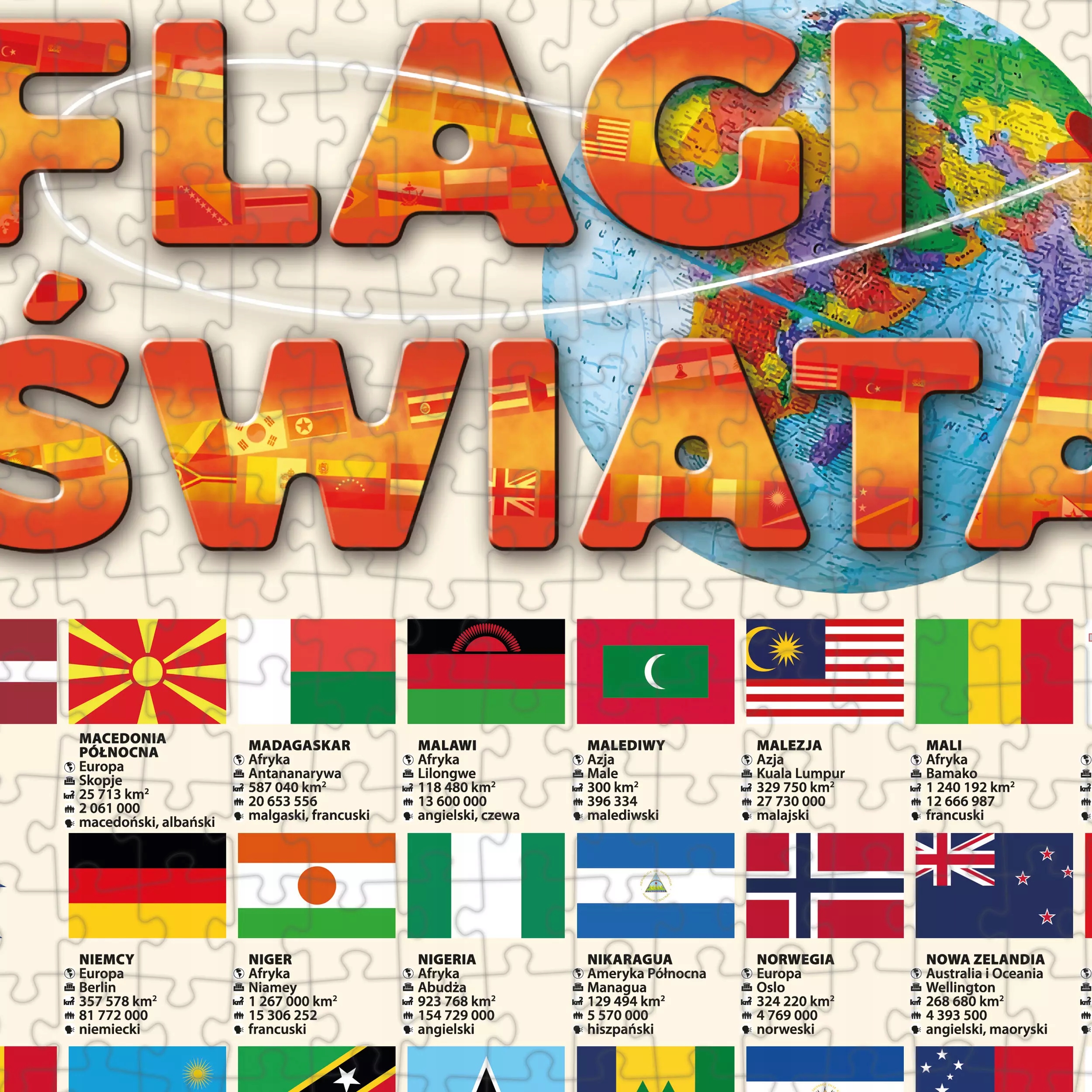 Они, безусловно, станут настоящим удовольствием для всех людей, жаждущих знаний, а также для настоящих энтузиастов флага. Расставив 1000 элементов, вы увидите разноцветную графику с расположенными в алфавитном порядке флажками размером 66х47 см, и это еще не все! Под каждым из них вы также найдете информацию о связанных с ними странах, таких как их столица, население, официальный язык, площадь и континент, на котором они расположены. Мы искренне верим, что после вечеров, проведенных за их обустройством, вопросы о поверхности Ватикана или цветах, используемых на флаге США, станут для вас детской игрой. Flags of the World Puzzle – продукт, благодаря которому вы сможете легко и приятно получить новые знания, развить свои интересы или расслабиться после тяжелого рабочего дня. Пазлы с флагами мира – тоже оригинальная идея для семейного вечера. Качество, эстетика исполнения и количество элементов делают эти пазлы идеальным подарком для взрослых и детей постарше.