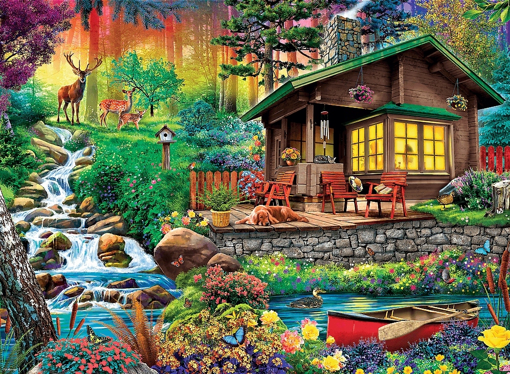 Пазл из 3000 деталей с изображением коттеджа в лесу.