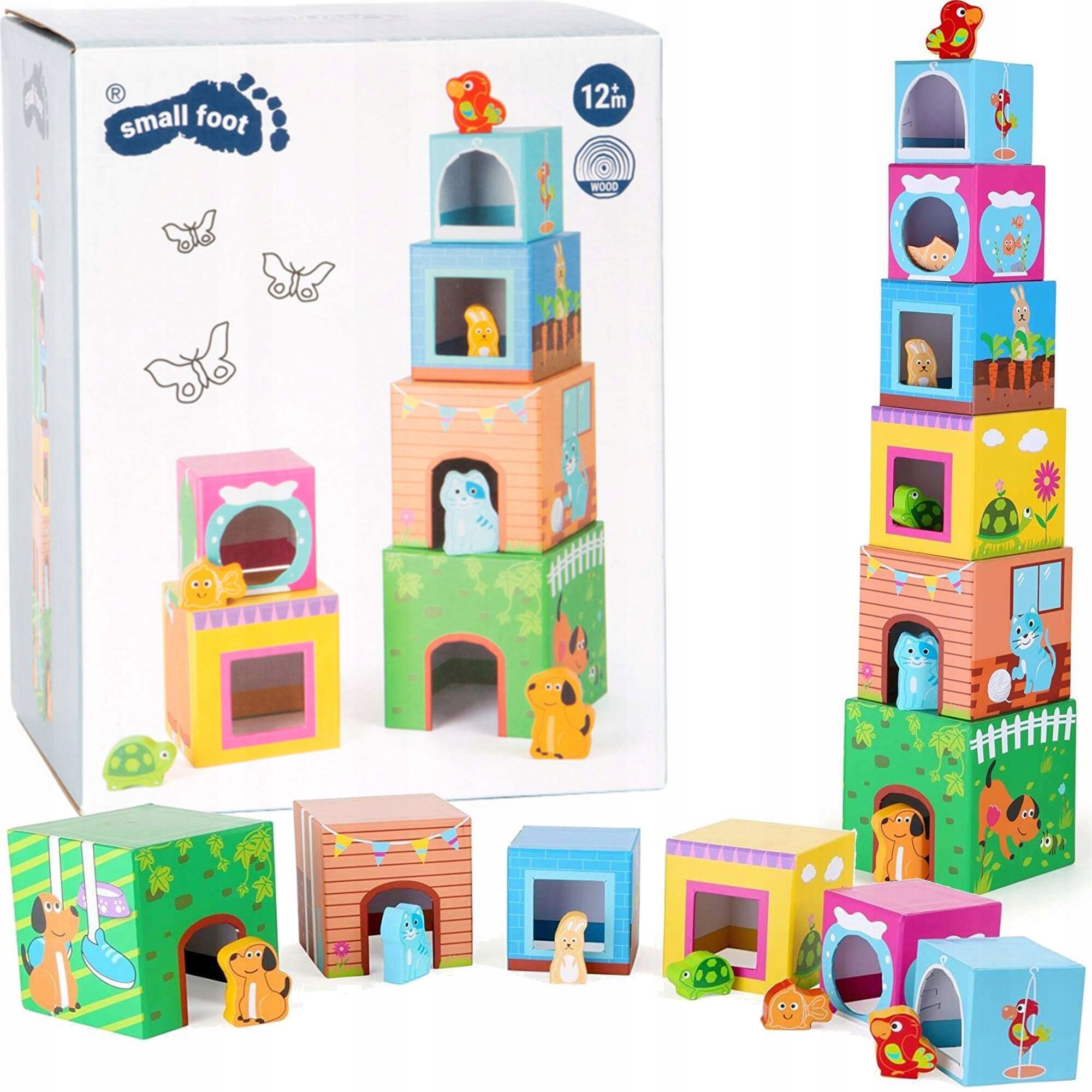 Пазл-пирамида с милыми животными, идеально подходящий для годовалого малыша. Малыш может создать из картонных кубиков красочную башню высотой 58 см. В набор также входят милые животные, которых можно разместить в картонных домиках.