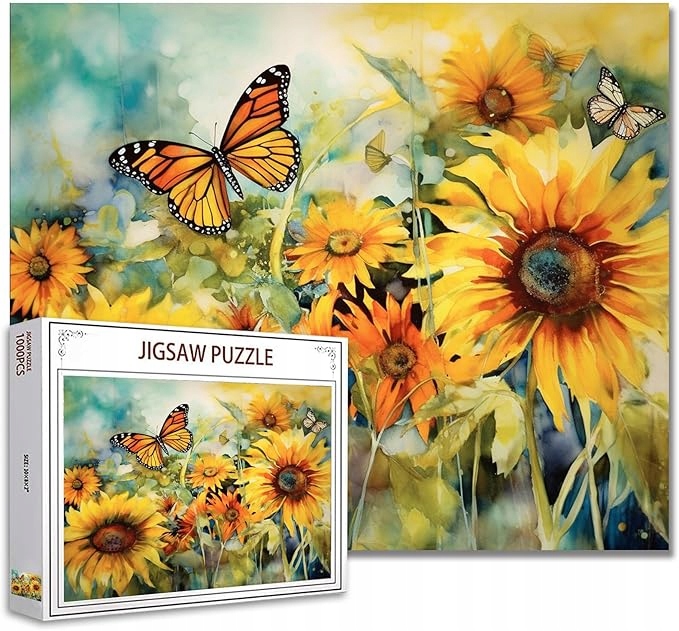 В пазле изображен живописный пейзаж с цветущими подсолнухами и разноцветными бабочками, наполненный деталями и яркими цветами. Это не только расслабляющее развлечение, но и настоящий праздник для глаз - идеально подходит для любителей природы и искусства.