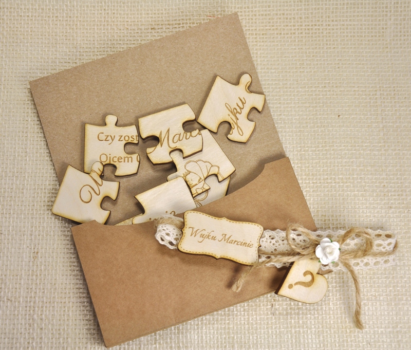 Пазл выполнен из дерева, на каждом элементе выгравирован текст вопроса - суть дела ;) Разумеется, запрос персональный - гравируем и имя будущей крестной или крестного, и имя ребенка.