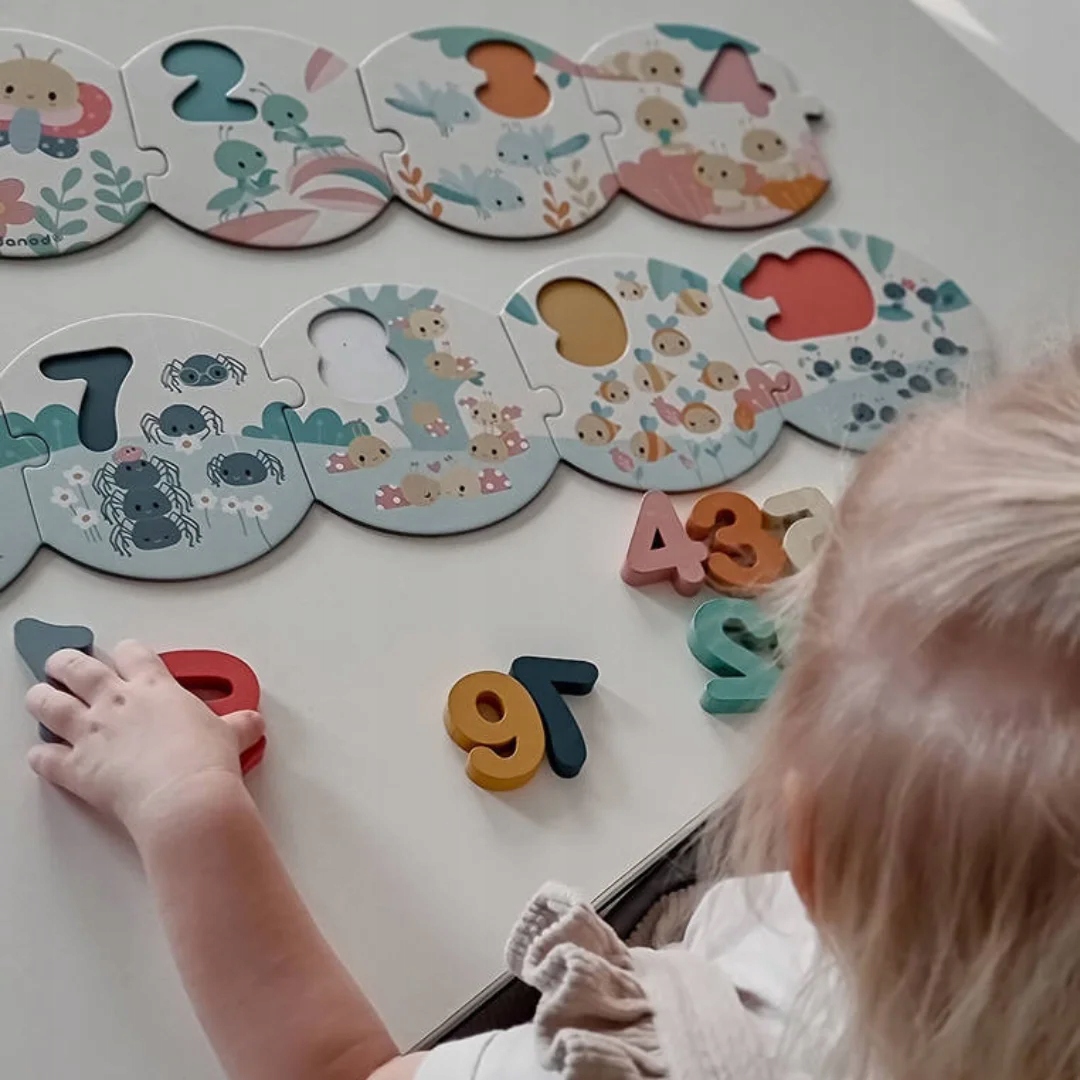 Пазл Учимся считать Pure 2+ Janod. Пазлы с деревянными цифрами из серии Pure французского бренда JANOD — это большой (длиной более метра) пазл, который поможет вашему ребенку приобрести умение считать и узнавать цифры от 1 до 10. Состоит из 20 элементов. : 10 круглых картонных пазлов, которые необходимо соединить вместе в правильном порядке, и 10 деревянных пространственных чисел — разместить их в соответствующих местах на этих досках-головоломках. На досках, оформленных в пастельных тонах, также размещены очаровательные иллюстрации насекомых (в том числе сверчков, муравьев, пауков и божьих коровок) в количестве, соответствующем числу, которое следует разместить на данном элементе. Большие размеры и простые формы позволяют легко комбинировать элементы. В комплект входит удобный мешочек на шнурке для хранения пазла.