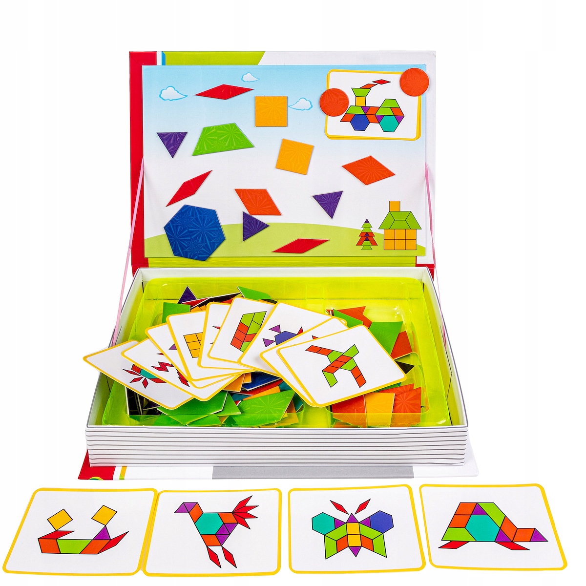 Магнитный пазл в закрытой коробке в виде книжки, которая при открытии используется для составления магнитных пазлов. Это отличное развлечение для творческих и изобретательных детей. В нем 140 красочных магнитов с элементами различных видов геометрических фигур и 30 карточек с примерами иллюстраций, которые можно создать из магнитов.
