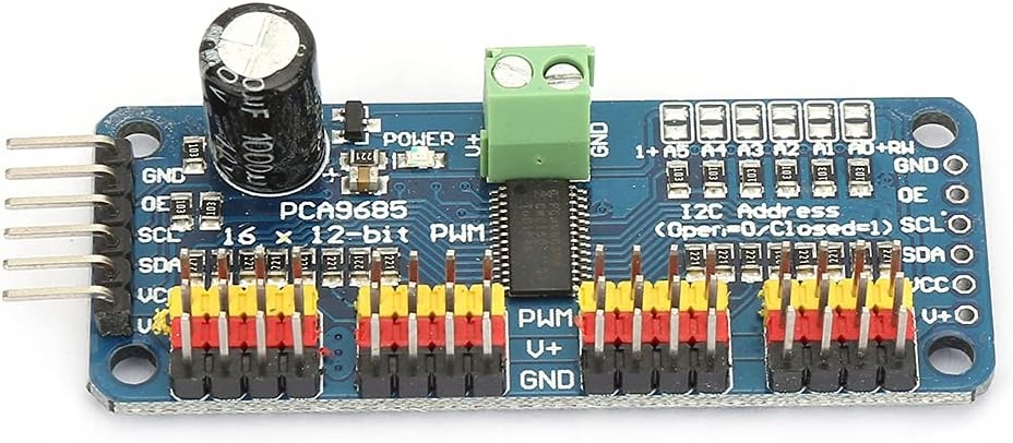 Об этом товаре АКСЕССУАР ДЛЯ РОБОТА: Модуль является отличной и замечательной деталью для создания робота, размер 60x25 мм/2,36x0,98 дюйма. ПРОСТОЙ В ИСПОЛЬЗОВАНИИ: используйте только два контакта, управляйте 16 свободными ШИМ-выходами! ВХОД I2C: вход I2C, управление 16 выходами ШИМ, может управлять 16 серводвигателями, имеет 12 бит. Разрешение 16 КАНАЛОВ: можно вставить 16 серводвигателей одновременно в 4 комплекта 3-контактных разъемов. ЗАЩИТА: вход защиты от обратной полярности на клеммной колодке.