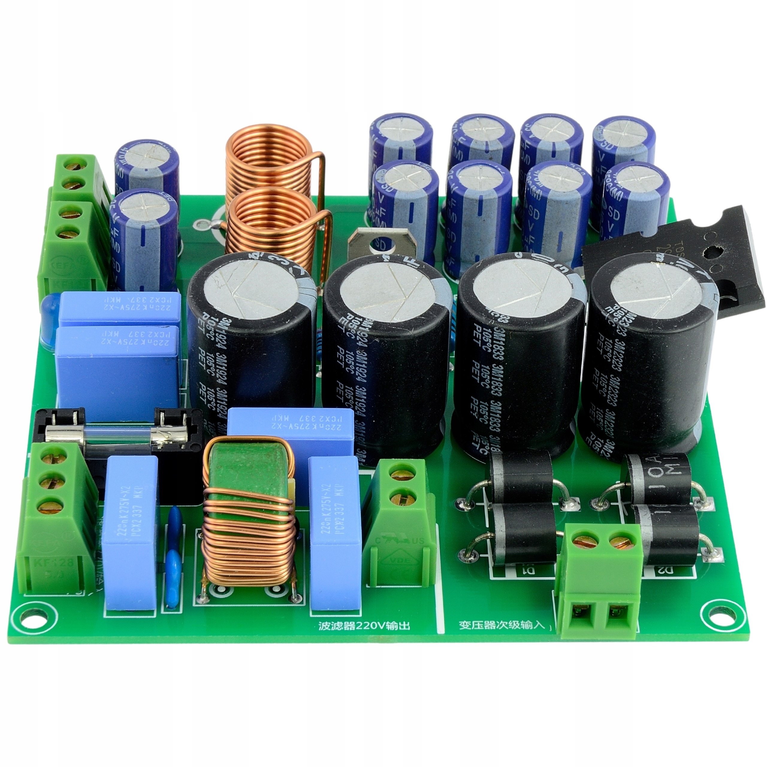 Конденсаторы: 4 х Rubycon YXG 3300 мкФ 35 В, 10 х Samwha SD 470 мкФ 35В, 7x Пилкор МКП 220нФ 275В X2 PCX2337
