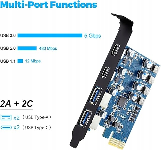 farboko pcie USB Card (2 x USB C, 2 x USB A), USB 3.0/USB 3.2 (USB 3.1) Gen1 5 Гбит/с USB для настольного компьютера с Windows 10/8/7/7/XP и ОС Mac Mac OS 10.8. PCIE X1 до 4 USB -порты, 2 X USB C, 2 X USB A. USB 3.0/3.2 (USB 3.1) Gen1 5 Гбит/с. Скорость передачи. Собственный источник питания не требует подключения дополнительного кабеля питания. Операционная система, совместимая с MAC 0S (из 10.8.2), Windows XP/Vista/2008 Server/7/8/10 и более новым, Linux. Подключите и воспроизводите, Windows 10 и Mac OS 10.8.2 или новее не требуют драйверов. В Windows XP/Vista/7 требуется установка контроллера. Драйверы можно найти на дисках, которые мы предоставляем