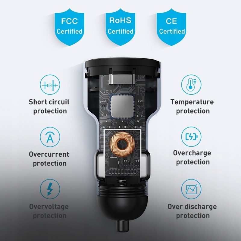 Быстрое автомобильное зарядное устройство – это аксессуар, который стоит иметь в машине. Он оснащен двумя разъемами: USB-A и USB-C. Благодаря этому вы можете подключить до двух устройств одновременно и быстро их заряжать.