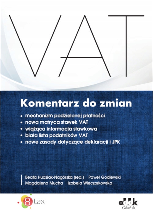 - Закон от 12 апреля 2019 года о внесении изменений в Закон о налоге на товары и услуги и некоторые другие законы (Законодательный вестник, ст. 1018), - Закон от 4 июля 2019 года о внесении изменений в Закон о налоге на товары и услуги и некоторые другие законы (Законодательный вестник, поз. 1520), - Закон от 31 июля 2019 года о внесении изменений в некоторые законы с целью снижения регулятивной нагрузки (Законодательный вестник, поз. 1495) и - Закон от 9 августа 2019 года о внесении изменений в Закон о налоге на товары и услуги и некоторые другие законы (Законодательный вестник, поз. 1751). Авторы, налоговые консультанты с многолетним опытом, четко обсуждают изменения, касающиеся, среди прочего: - разделенный механизм оплаты, - новая матрица ставок НДС, - информация об обязательной ставке, - белый список плательщиков НДС, - ограничения на личное освобождение, - новые правила выдачи счетов-фактур в квитанции, - уточнение условий исключения налогоплательщиков, не подающих декларации, из реестра НДС, - упрощения корректировки входящего НДС в случае возврата к освобождению от налога, - новые правила относительно деклараций и JPK, - новые санкции за ошибки в записях.