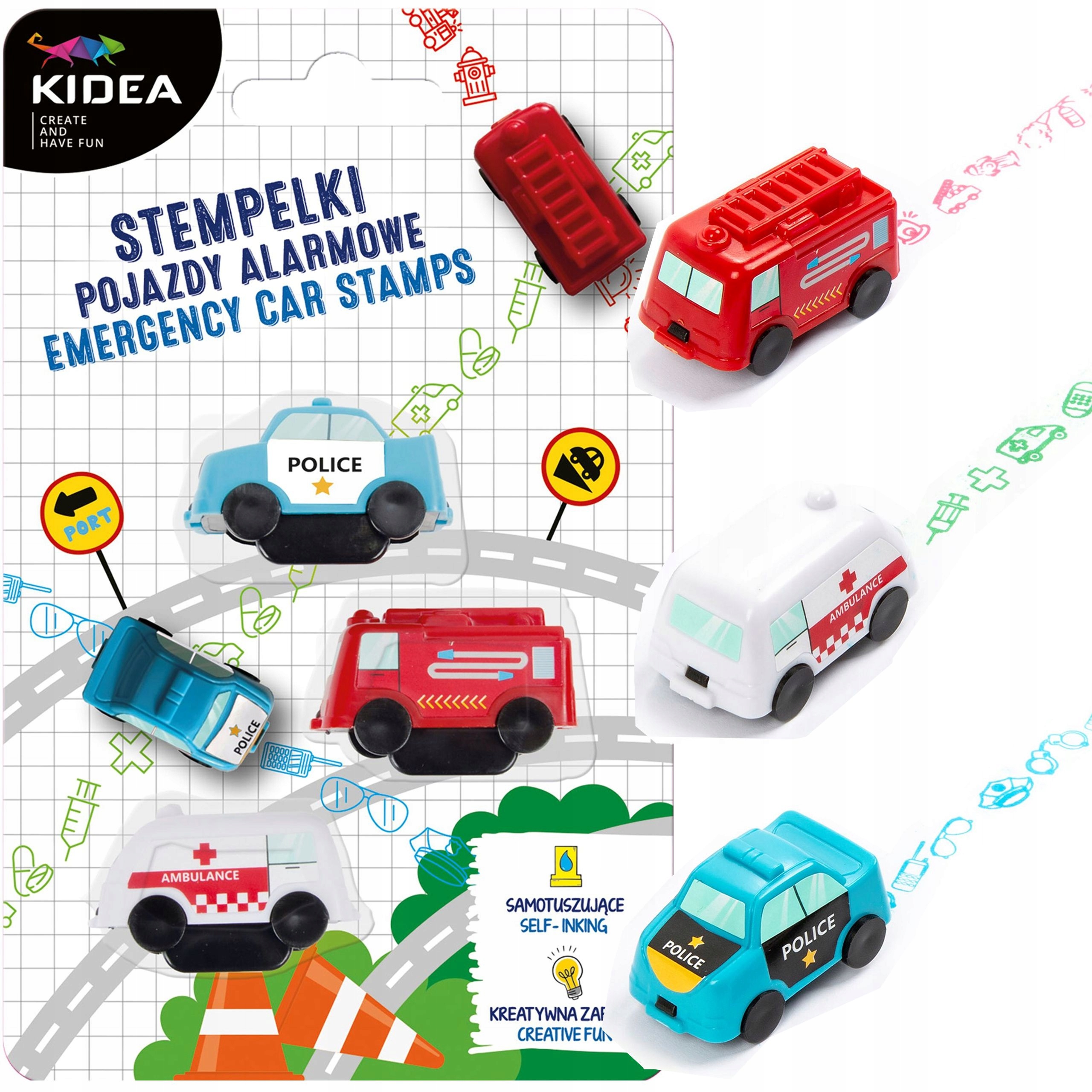 - Марки детские в виде машин скорой помощи: полиции, скорой помощи и пожарной команды.