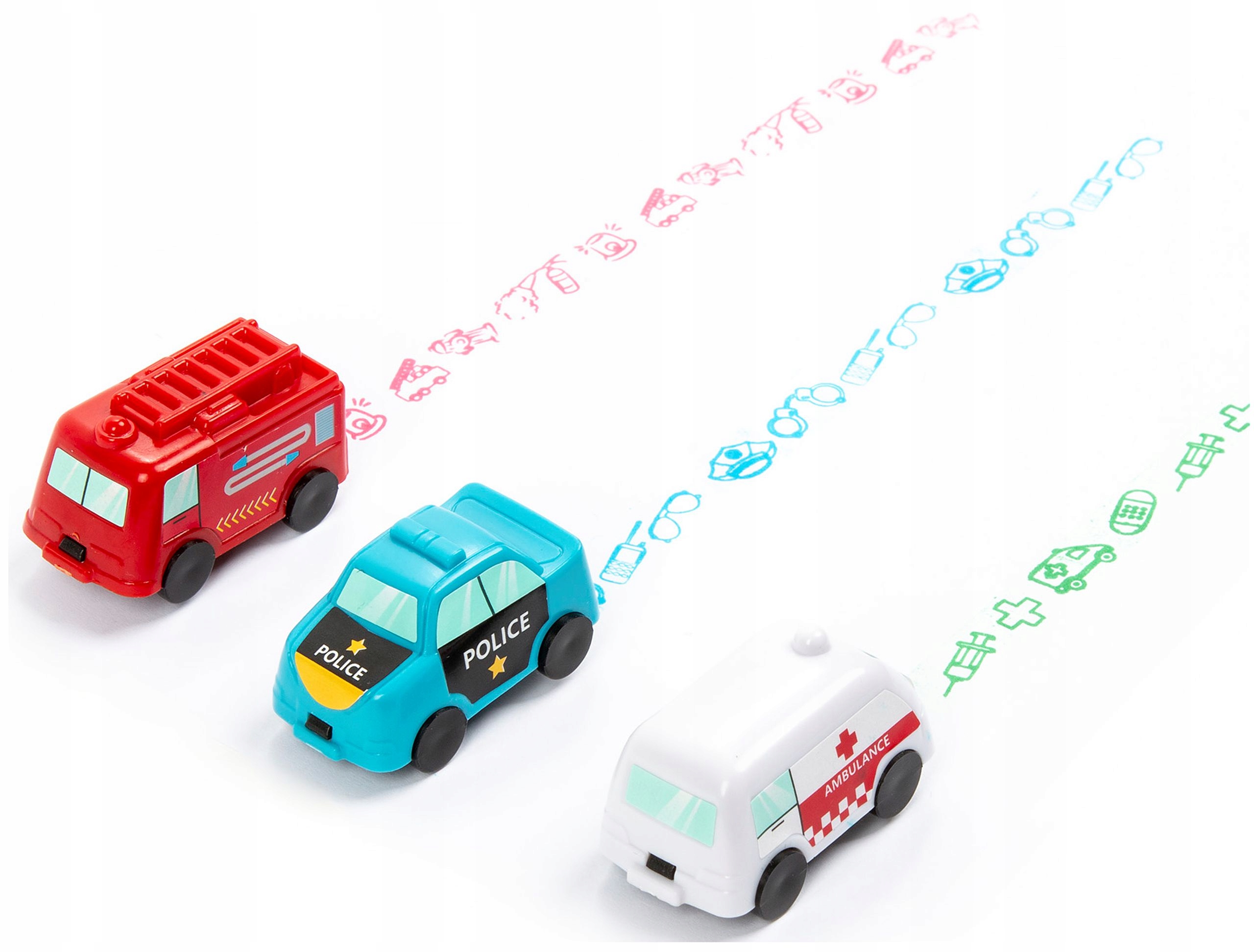 - Машины оставляют на бумаге фигуры, связанные с профессиями полицейского или пожарного и врача, знакомя детей со знаниями об этих важных профессиях.
