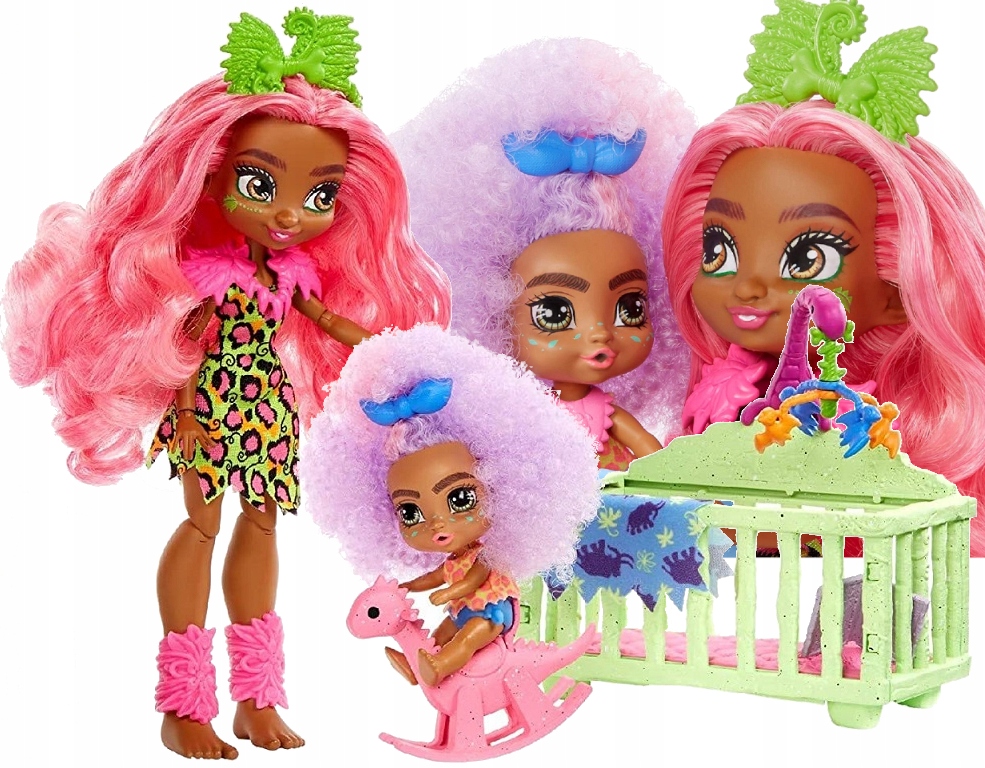 В наборе есть все необходимое, чтобы позаботиться о непослушном подопечном, в том числе кроватка с милым мобилем в стиле динозавра, который действительно вращается — просто толкните его. Когда Фурра проснется после сна, прикрепите ее к качающемуся динозавру и переместите, чтобы увидеть, как она качается. С помощью небольших аксессуаров дети могут разыгрывать что угодно: от закусок до сказок на ночь. Две куклы Cave Club с яркими волосами и неоновыми нарядами вдохновляют на доисторические приключения.