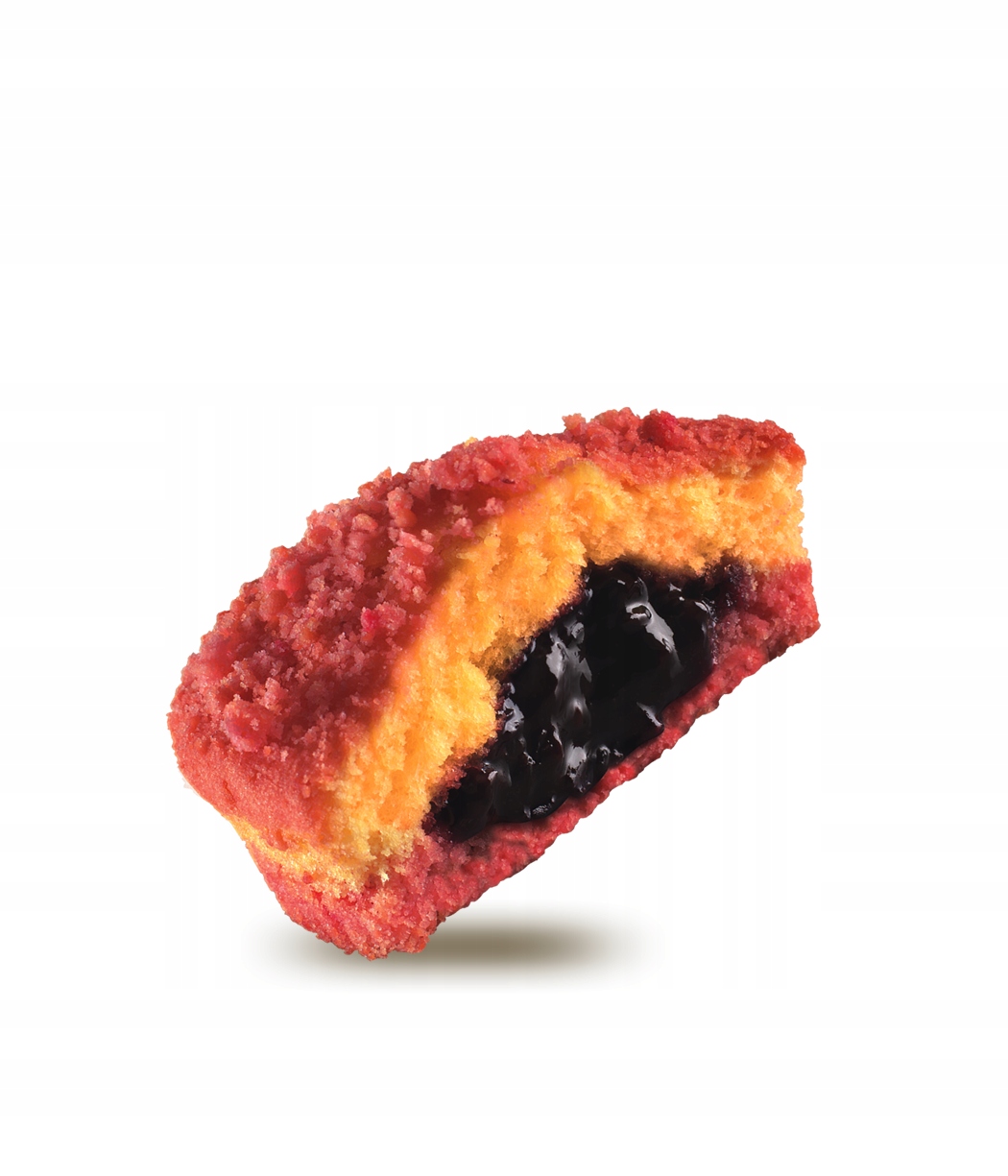 Состав: мука ПШЕНИЧНАЯ мягкая типа «0», сахар-песок, крахмал ПШЕНИЧНЫЙ, меланж (МАСЛО 50% ПОДСОЛНЕЧНОЕ масло, кокосовое масло), ЯЙЦА цельные пастеризованные, мука абрикосовых косточек, алкермас (ароматизаторы, краситель: азорубин, карамель), масло подсолнечное высокоолеиновое, йогурт полножирный (МОЛОКО), сироп глюкозы, ароматизаторы, желток яичный, белок сывороточный МОЛОЧНЫЙ, эмульгатор: моно- и диглицериды жирных кислот, эмульгатор: соевый лецитин, соль. Начинка 31%: пюре малиновое 15% (сироп глюкозо-фруктозный, сахароза, пюре малиновое 20%, загуститель: пектин, регулятор кислотности: лимонная кислота, консервант: сорбат калия, краситель: антоцианы, ароматизаторы) пюре ежевичный 16% сироп глюкоза-фруктоза , пюре ежевики 25% сахароза, карамель, загуститель: пектин, регулятор кислотности: лимонная кислота, консервант робинат калия, антоциановый краситель, ароматизаторы)