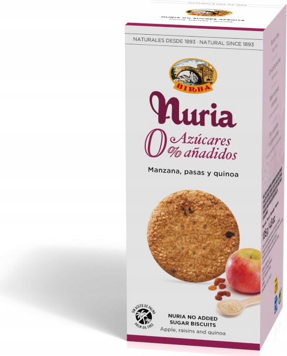 Ингредиенты: пшеничная мука 55%, подсластитель: мальтит, оливковое масло 7%, киноа 3%, изюм 3%. , сухое обезжиренное молоко 3%, яблоко 2% (яблочное пюре и концентрированный сок, натуральный яблочный ароматизатор и цитрусовая клетчатка), разрыхлители: бикарбонат натрия и аммония, растительная клетчатка, соль.