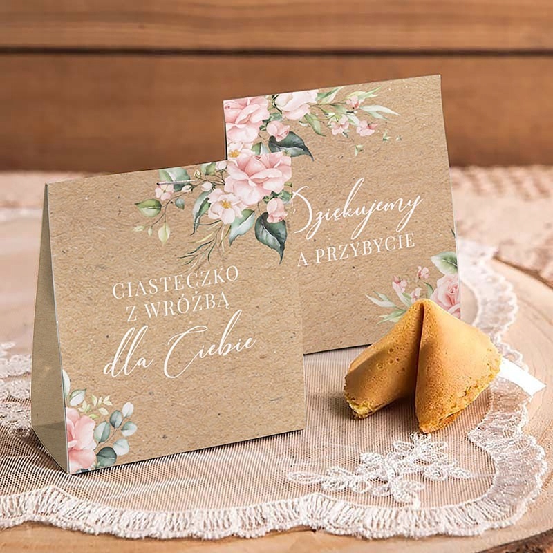 Печенье с предсказаниями на свадьбу, упакованное в специальную упаковку с графикой и текстом благодарности, украшенное принтом из пудровых цветов. Печенье – это удивительный подарок гостям на свадьбе и вкусное дополнение для девушек на девичнике. Размещенные рядом с сервировкой для гостей, они станут прекрасным дополнением подготовленной композиции.