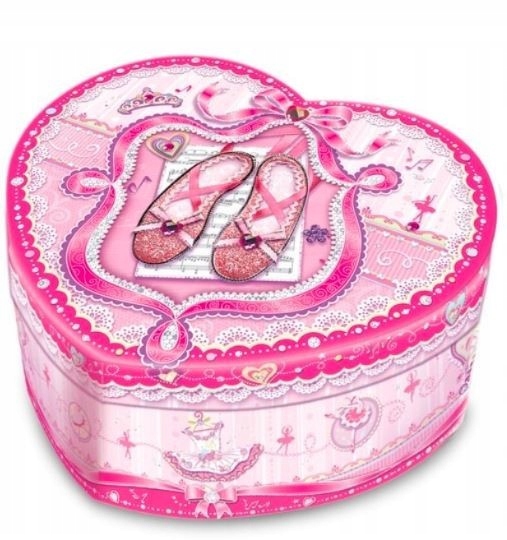 Музыкальная шкатулка в форме сердца с изображением тапочек, играющая классическую мелодию. Когда мелодия перестанет играть, просто заведите музыкальную шкатулку. Он работает благодаря специальному механизму и не требует батареек. В открытом виде видна фигура балерины, кружащейся вокруг. Кроме того, в музыкальной шкатулке есть зеркало и место, где можно спрятать мелкие предметы.