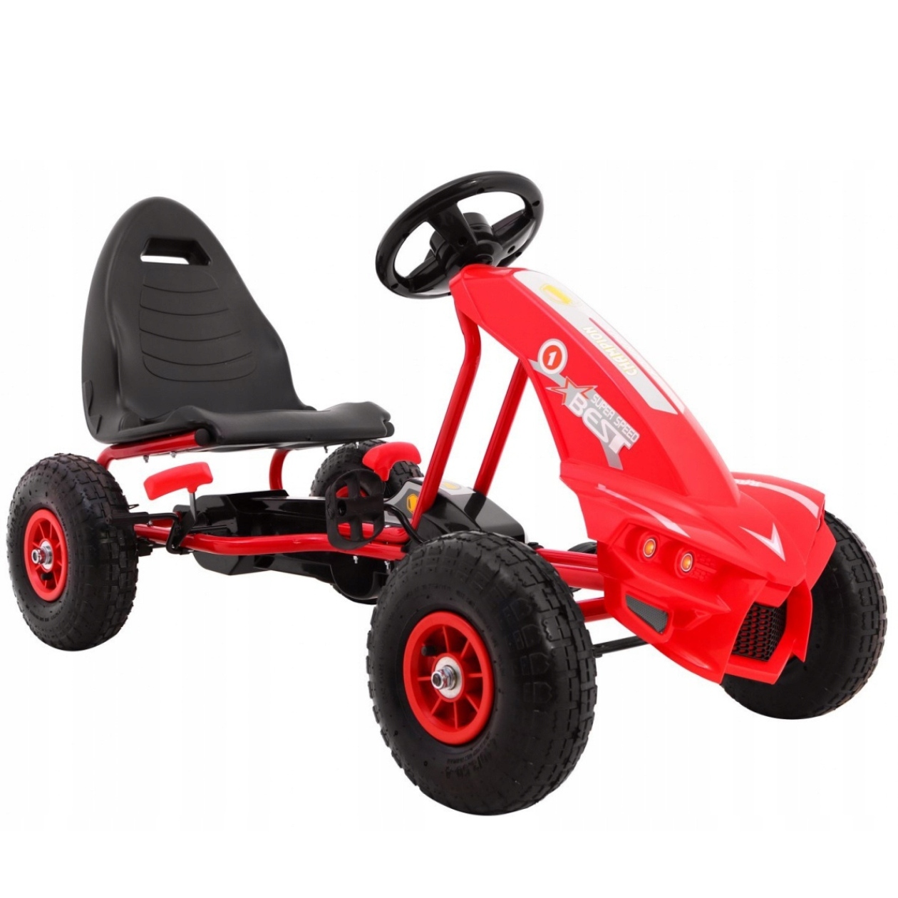Экспрессивный красный цвет привлекает глаз и добавляет спортивный персонаж Гокарту. Цвета привлекательны для детей и помогают отличить автомобиль, играя во дворе.