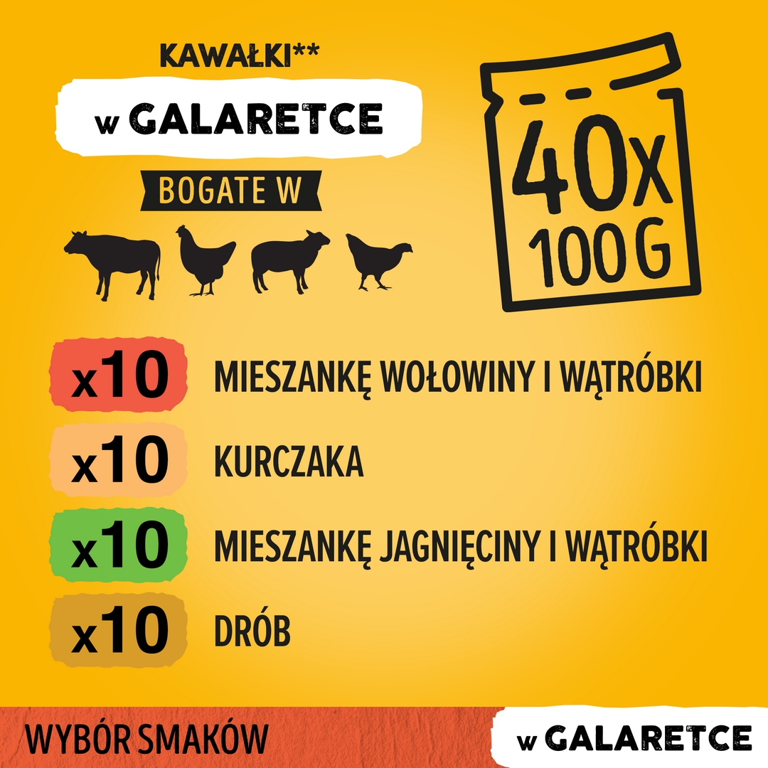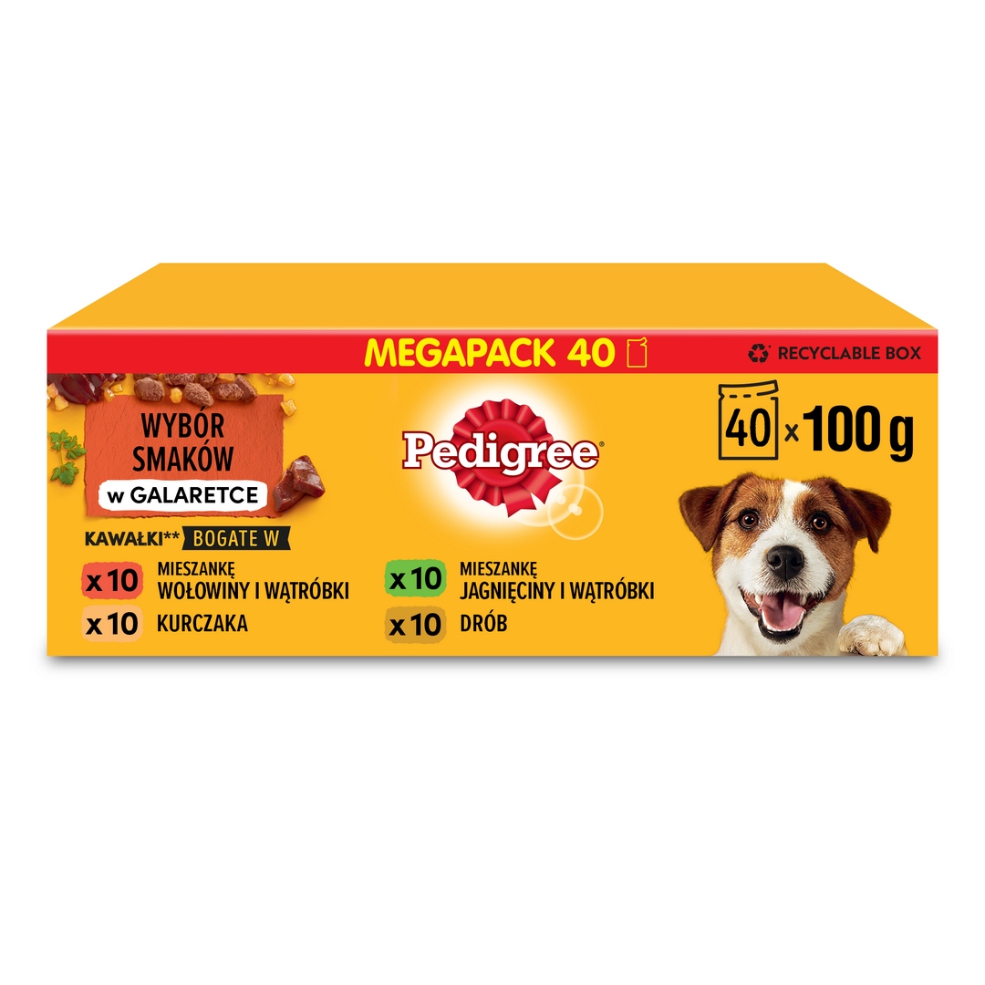 PEDIGREE® Смесь вкусов для взрослых в желе — это полноценный и сбалансированный корм, полный мясных кусочков, погруженных в желе, с четырьмя вкусами: кусочки, богатые смесью говядины и печени, куски с содержанием курицы, куски с содержанием смеси баранины и печени и куски с содержанием птицы.