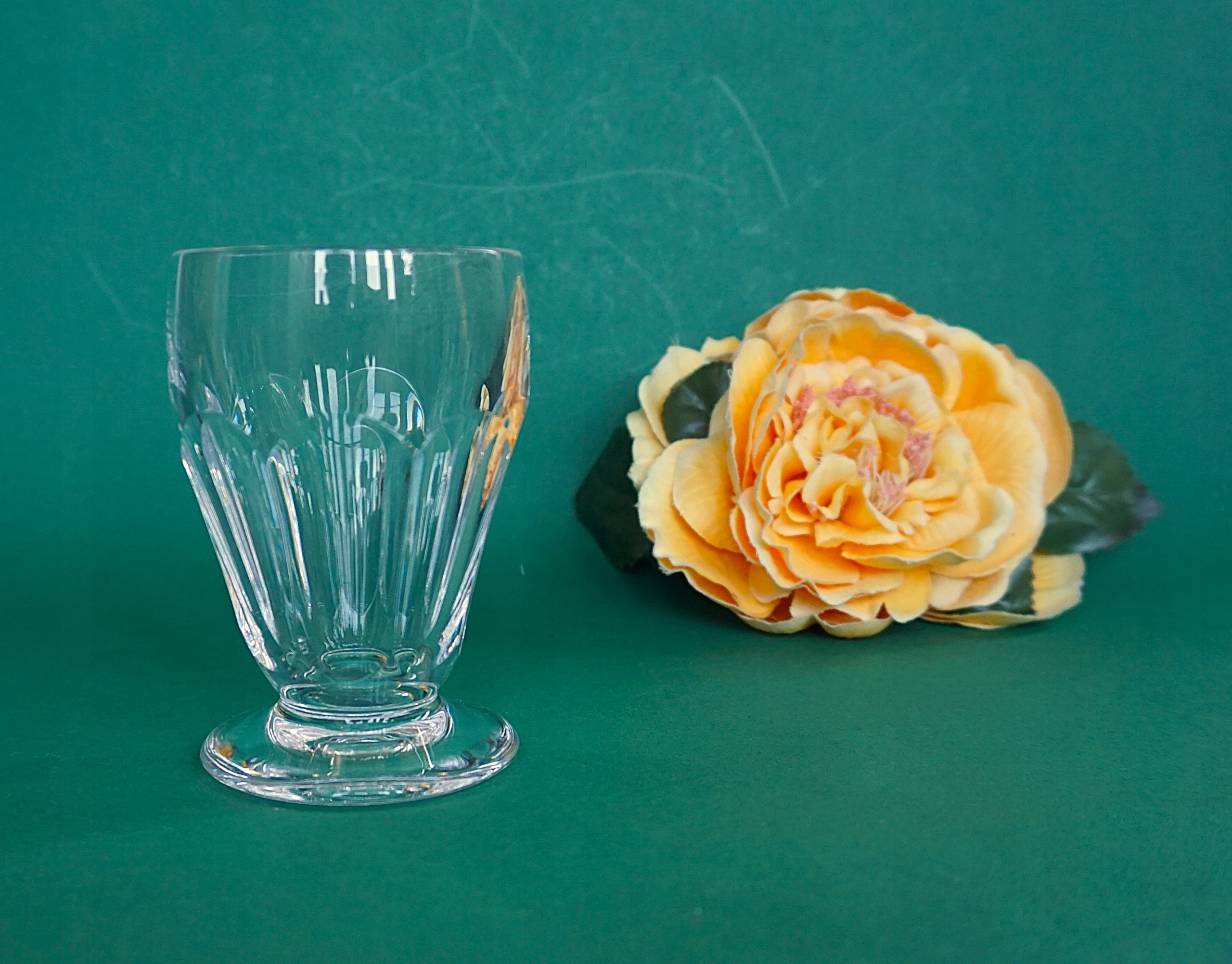 Стекло хрустальное, довольно тяжелое, с чудесным тоном. Вся бесцветная, простого кроя, чаша восьмиугольная у основания.