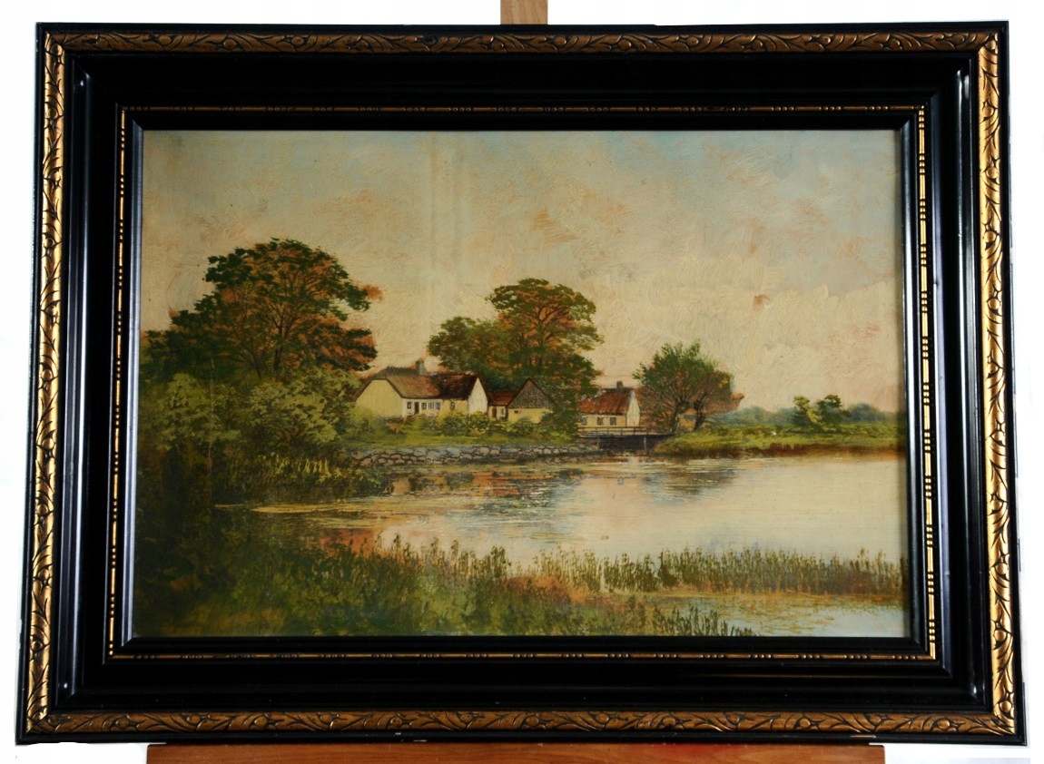 "Пейзаж с деревней на пруду" Очень хорошая старая нефтяная картина !!!