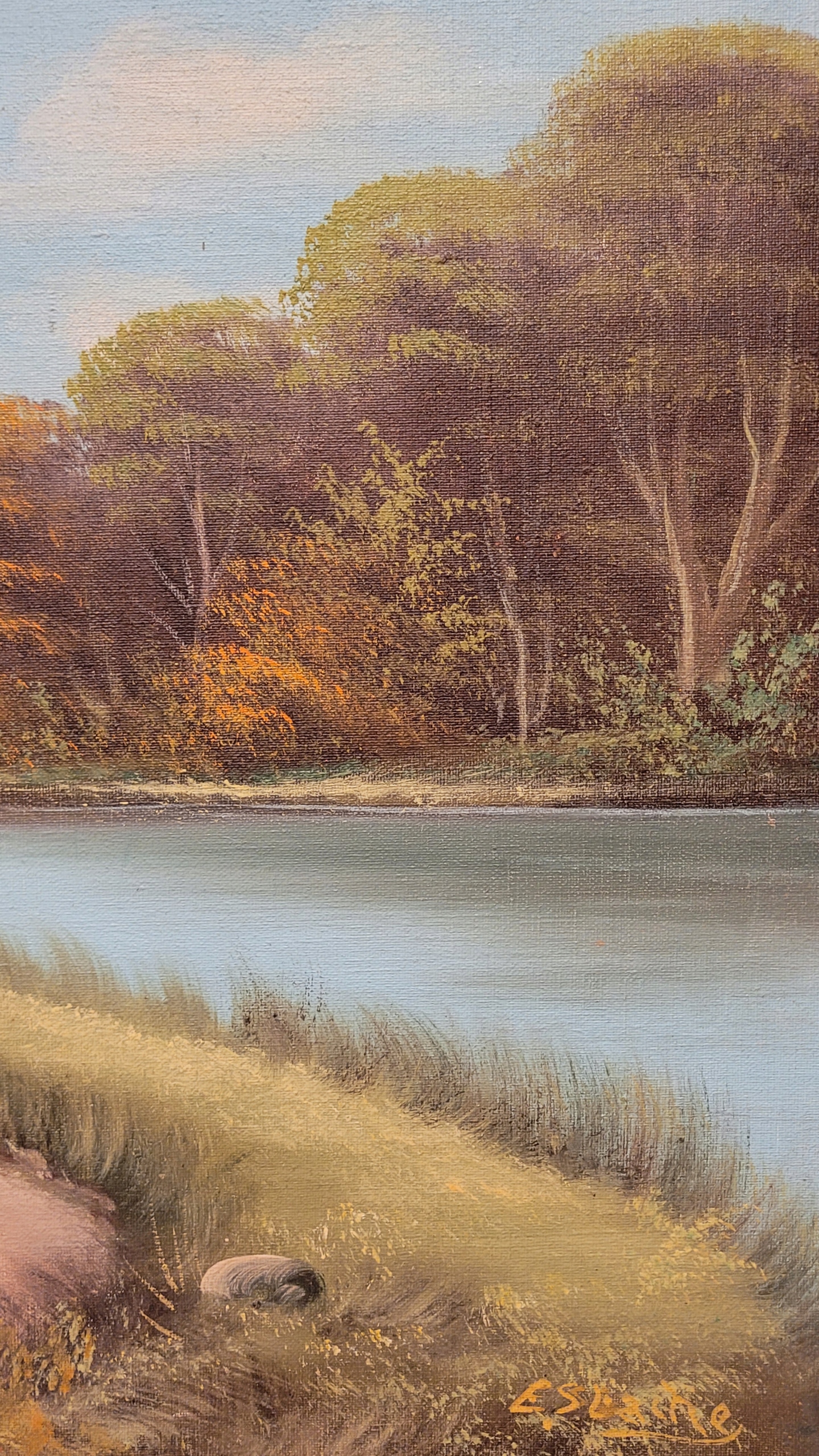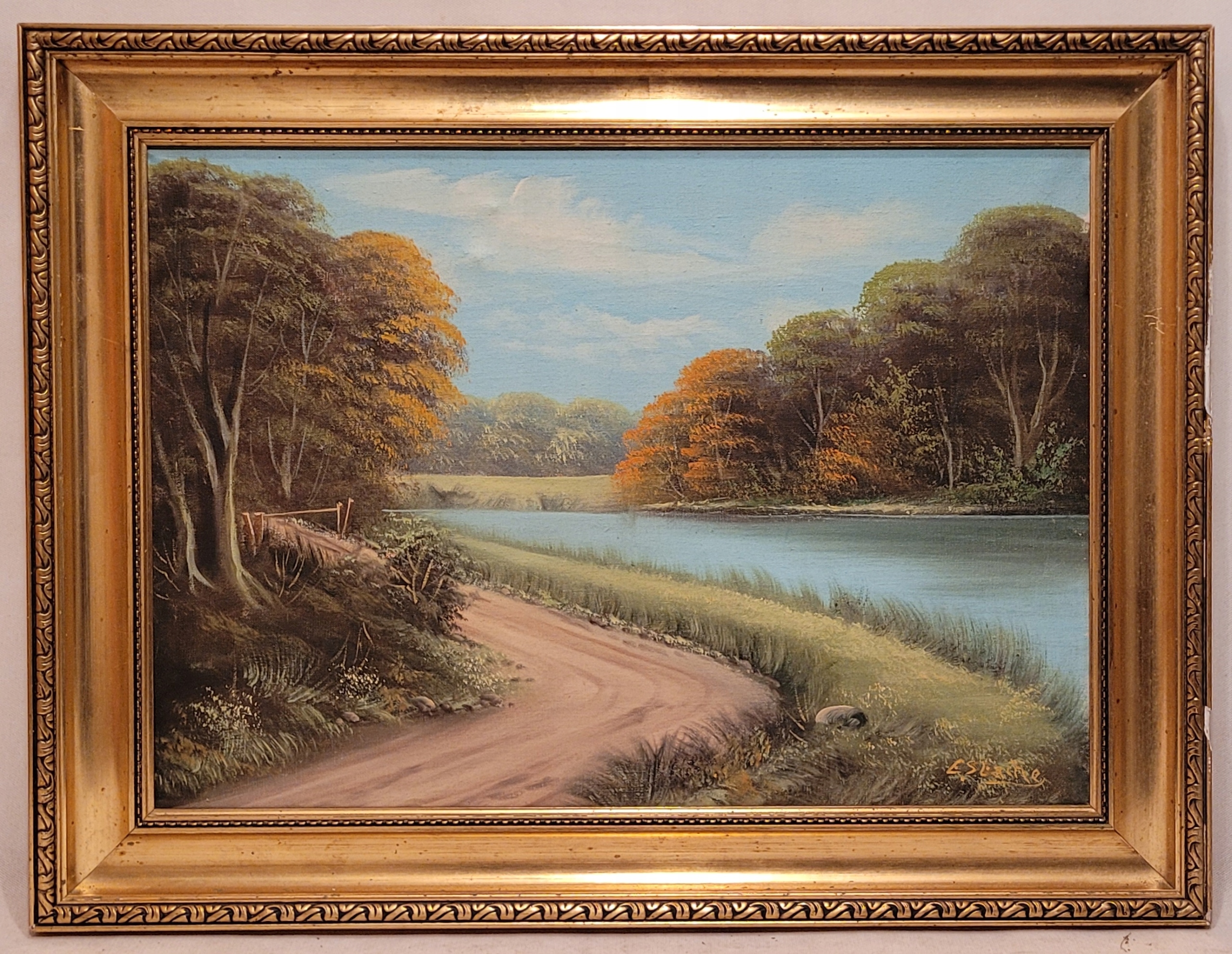 "ПЕЙЗАЖ С РЕКОЙ", старинная, подписанная картина маслом.
