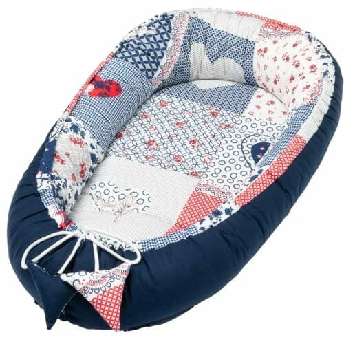 Solvera_Ltd Baby Nest, двухсторонний экологически чистый бампер для детской кроватки для новорожденных, 100% хлопок, уютное гнездышко, мягкая и безопасная дорожная кроватка с плоской спальной поверхностью (50 x 90) (пэчворк/синий)
