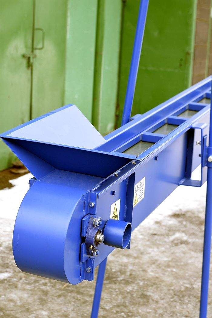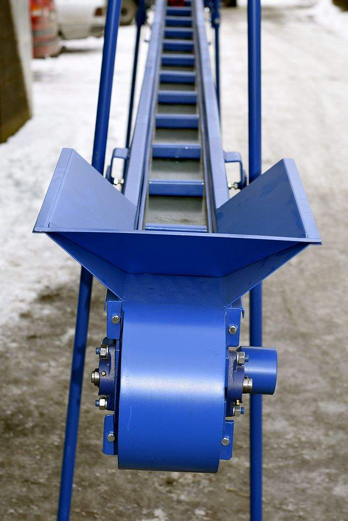 Принцип работы очень прост, приводной ролик тянет ленту, вооруженную стальными скребками, формируемыми на этапе производства для заданного сырья и его конечной высоты выпуска.