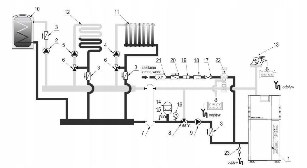 1- котел, 2- насос ГВС, 3- обратный клапан, 4- насос центрального отопления, 5- насос теплого пола, 6- трехходовой смесительный клапан, 7- гидравлическая муфта, 8- термостатический клапан 55 градусов С, 9 - насос котла (короткое замыкание), 10 - бак ГВС, 11 - радиатор, 12 - система подогрева пола, 13 - группа безопасности, 14 - расширительный бак, 15 - колпачковый клапан, 16 - манометр, 17- запорный клапан, 18- редуктор давления, 19- фильтр, 20- обратный клапан, 21- противозагрязняющий клапан, 22- тепловая защита от перегрева (например, клапан ДБВ-2), 23- шаровой сливной кран< /п>