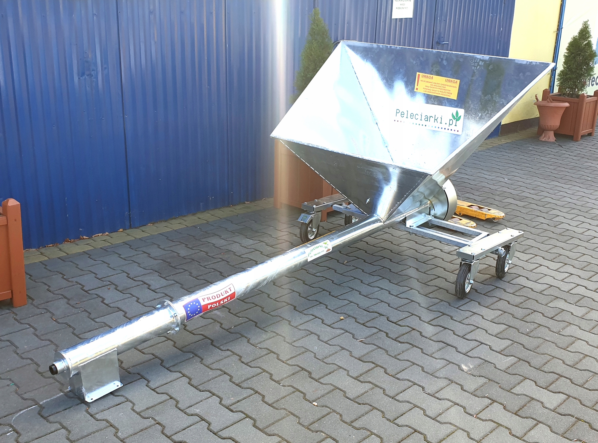 Устройство полностью оцинковано, что делает его устойчивым к истиранию, ржавчине и царапинам. Прочная конструкция устройства на тележке и 4 колесах позволяет кормушке свободно перемещаться даже по неровным поверхностям. Загрузочный бункер максимально увеличен (самый большой на рынке), поэтому одноразовая загрузка позволяет очень долго работать без обслуживания. Форма винта имеет эргономичную форму, благодаря чему винт не засоряется и обеспечивает безотказную работу.
