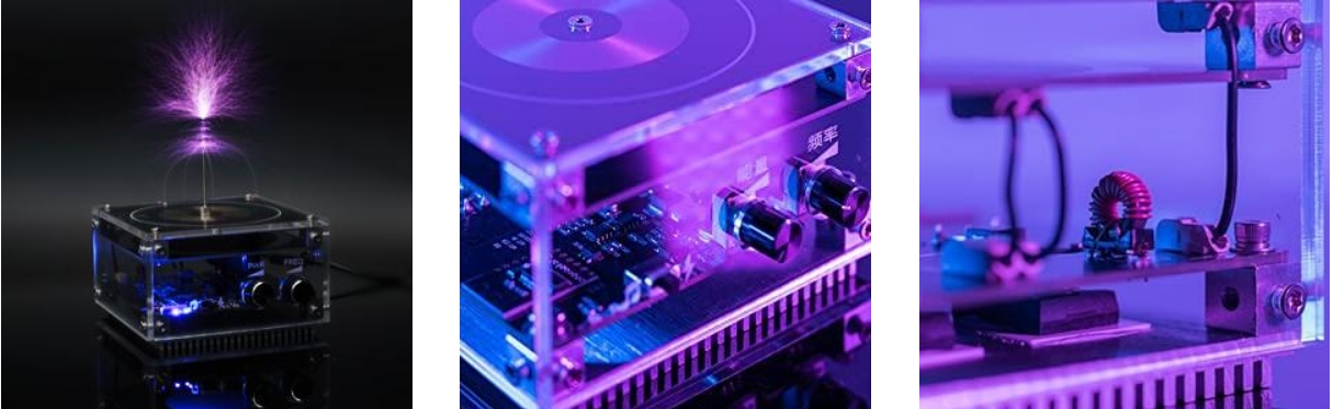 После подключения к источнику питания и сопряжения по Bluetooth катушка начинает излучать молнии синхронно с музыкой. Эффект потрясающий — плазменная дуга «танцует» в ритме песен, создавая на вашем столе мини-световое шоу.