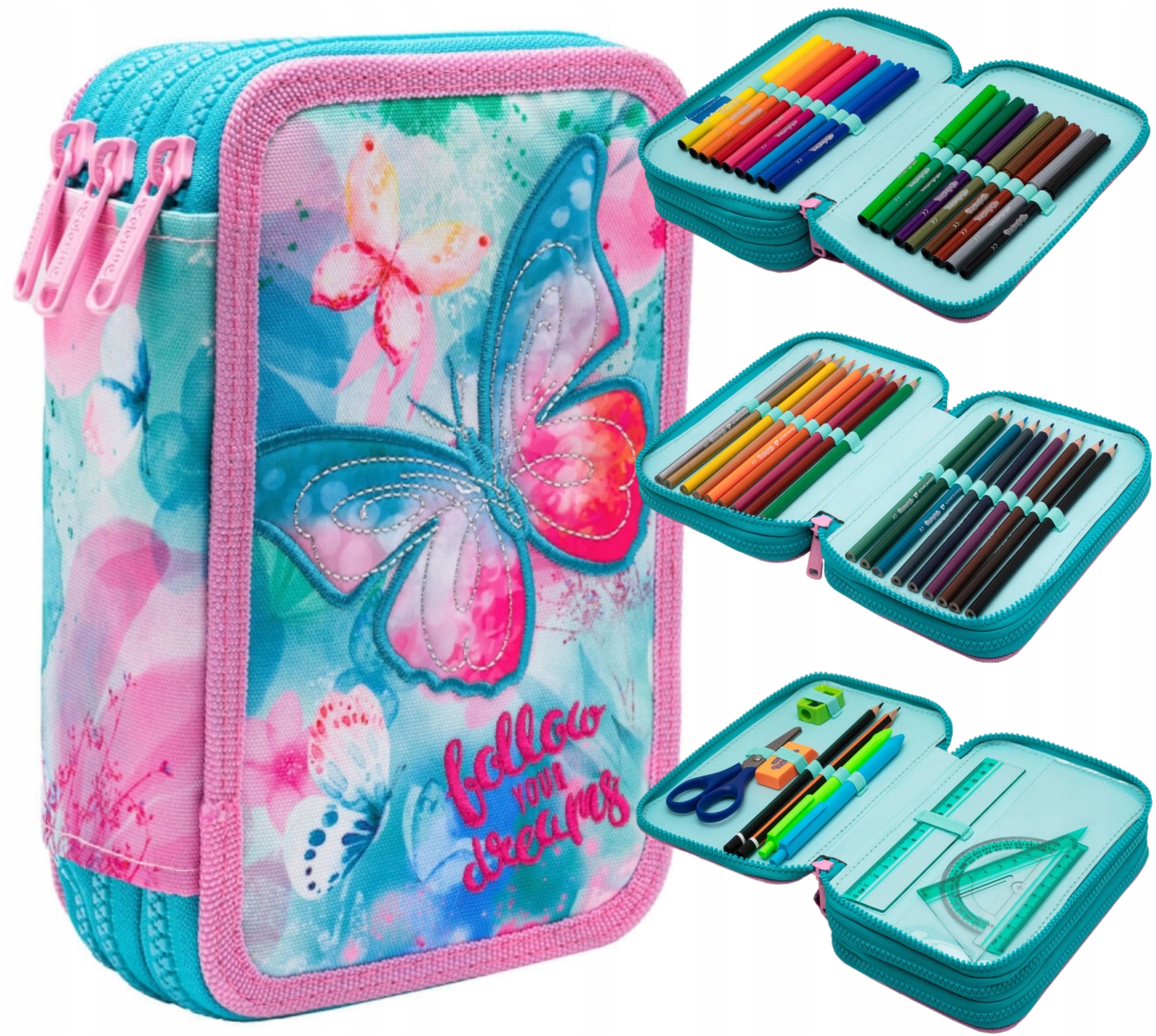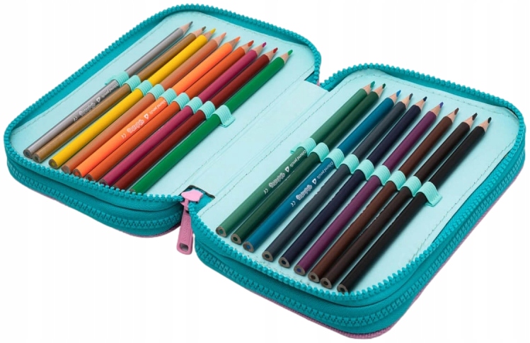 Пенал с тремя отделениями на молнии. Прочно выполнен из высококачественных материалов в каждой детали. В отделениях пенала имеются резиновые держатели для школьных принадлежностей - внутри полноценная комплектация Colorino.