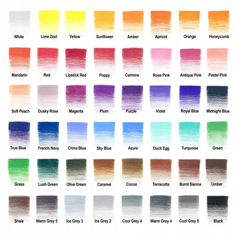Янтарь • Античный розовый • Абрикос • Небесно-голубой • Черный • Сиена жженая • Карамель • Кармин • Китайский синий • Какао • Холодный серый 4 • Холодный серый 5 • Утиное яйцо • Темно-розовый • Французский темно-синий • Травяной • Зеленый • Соты • Ледяной серый 2 • Ледяной серый 3 • Лаймовая корка • Губная помада красная • Ярко-зеленый • Пурпурный • Мандарин • Полуночно-синий • Оливково-зеленый • Оранжевый • Пастельно-розовый • Сливовый • Мак • Фиолетовый • Красный • Розовый • Королевский синий • Сланцевый • Небесно-голубой • Мягкий персик • Подсолнух • Терракота • Бирюзовый • Янтарный • Фиолетовый • Теплый серый 4 • Теплый серый 5 • Белый • Желтый