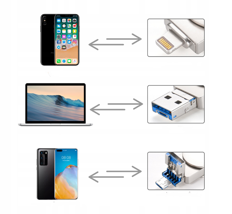 Pendrive MAXXER flash dysk zewnętrzna mobilna przenośna c szybki 128 GB Lightning, Micro-USB, USB 2.0, USB 3.0, USB 3.1 typ C srebrny