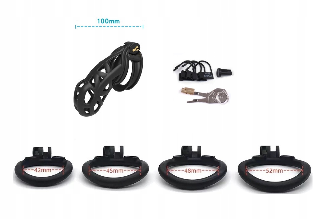 В комплект входят: запираемый пояс верности, четыре кольца, 5 черных одноразовых застежек.