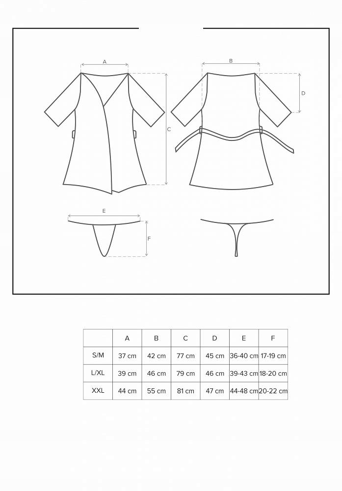 Халат завязывается тонким атласным поясом, поэтому вы можете регулировать пеньюар по своему усмотрению. Все это дополняет стринги, соблазнительно подчеркивающие ягодицы.