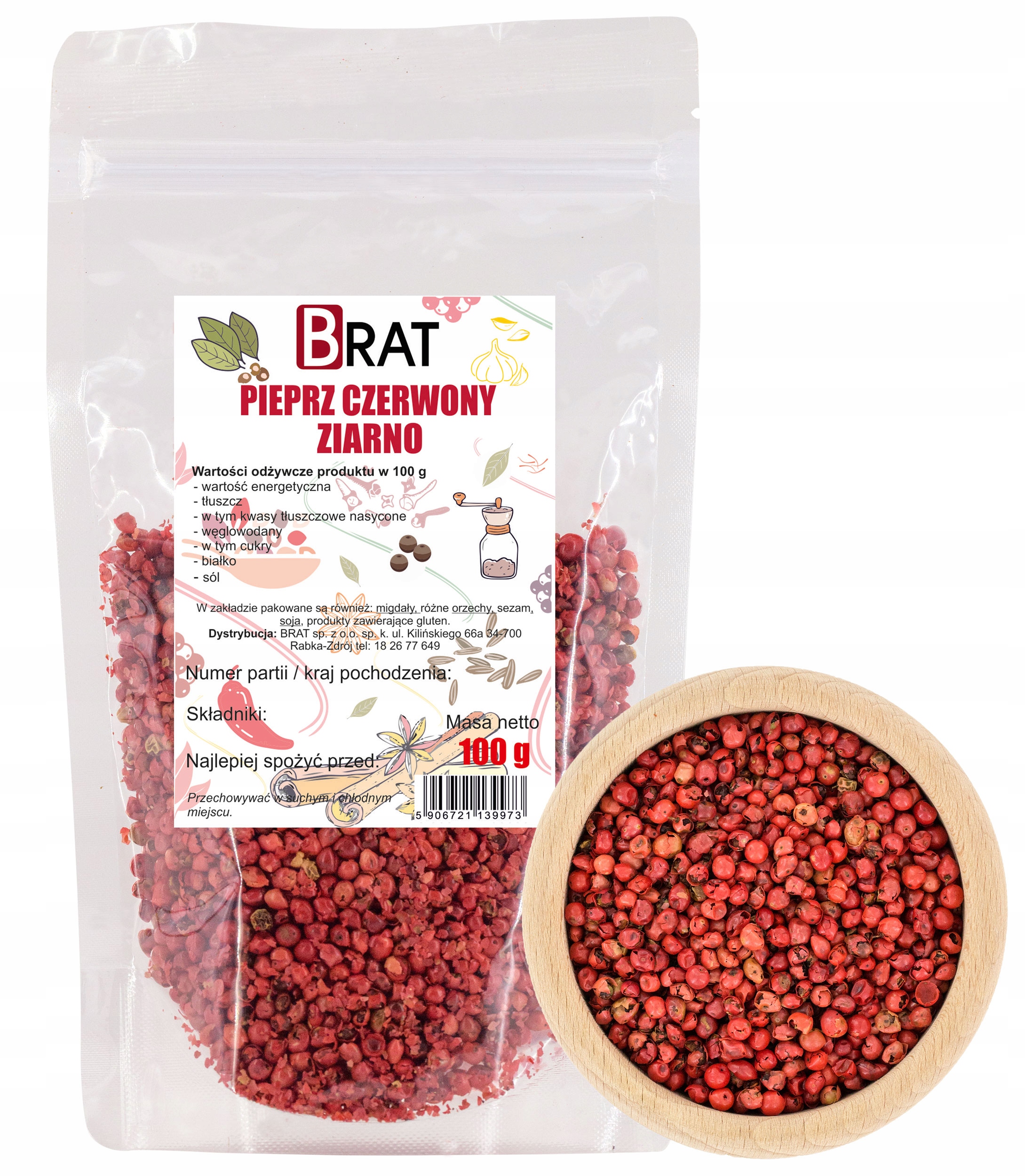 Красный перец, также известный как розовый или бразильский перец. Черный, белый и зеленый перец происходят из одного и того же растения, они различаются временем сбора и процессом, которому подвергаются зерна после сбора. Хотя все кажется ясным, путаницу вносит красный перец, который на самом деле не имеет отношения к черному перцу. Названа так из-за схожего внешнего вида и вкуса плодов.