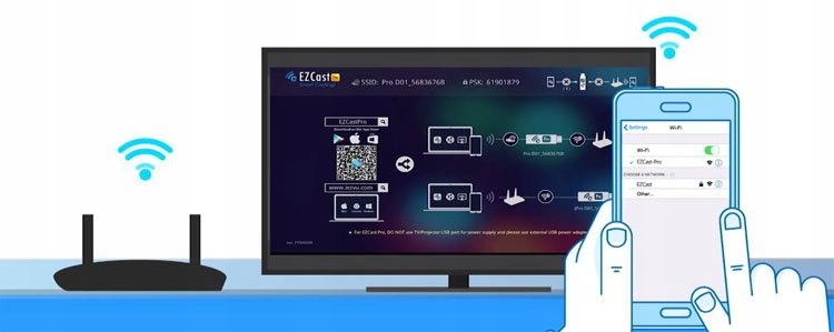 Каждый должен иметь возможность без проблем установить и использовать его. Подключите EZCast Pro B02, например, к телевизору с помощью кабеля HDMI, затем к источнику питания и включите его. Включите беспроводную сеть Wi-Fi на смартфоне и зайдите в настройки. Найдите сеть EZCast Pro B02 (ProBox_xxxxxxx или ProBox5G_xxxxxx) и подключитесь к ней. Тогда включите приложения EZCast Pro и наслаждайтесь широким спектром возможностей и функций.