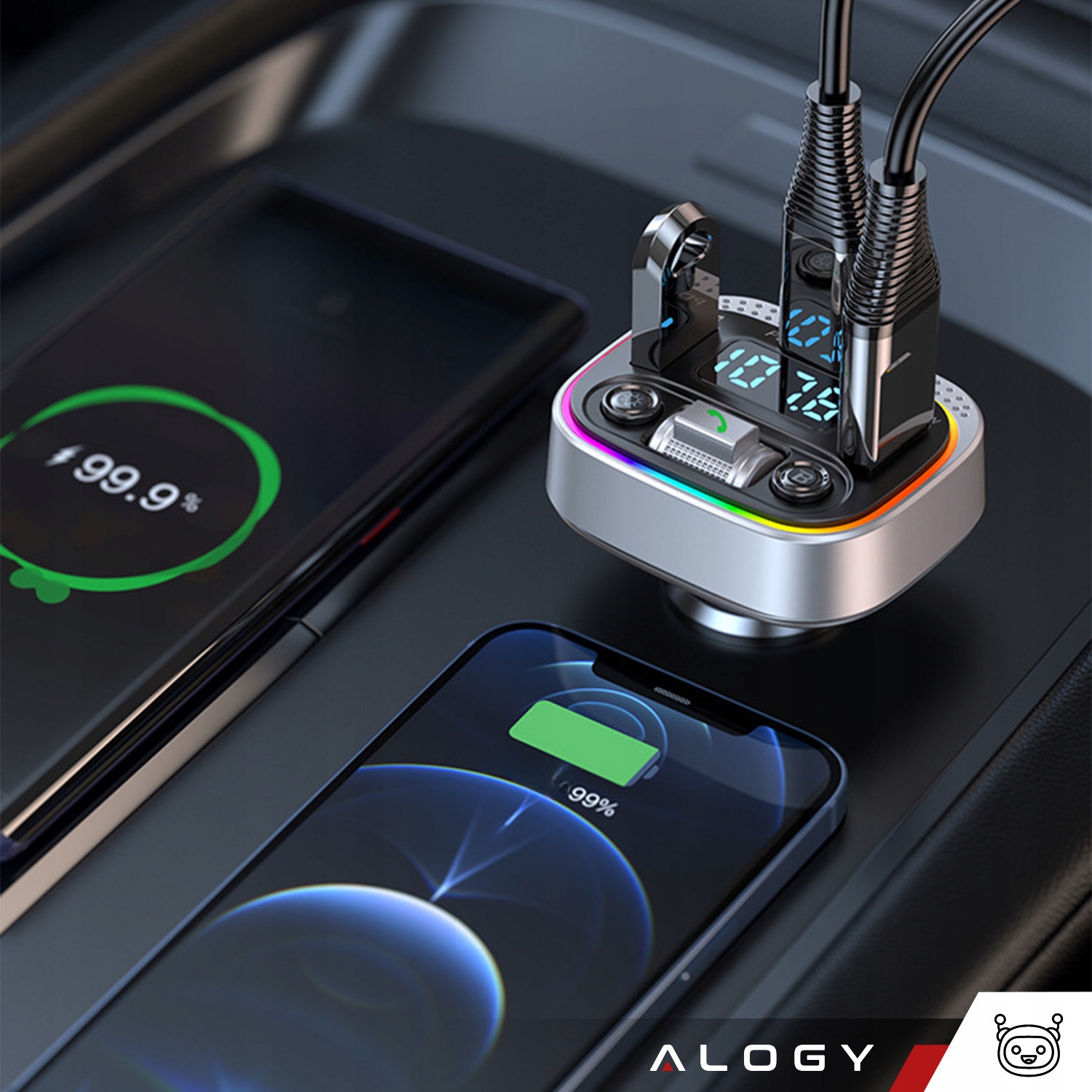 ▶ ️ Bluetooth fm Mp3 автомобильный передатчик Fast 2 x USB QC 3.0 + USB-C C C PD 20W RGB Alogy Car Silver